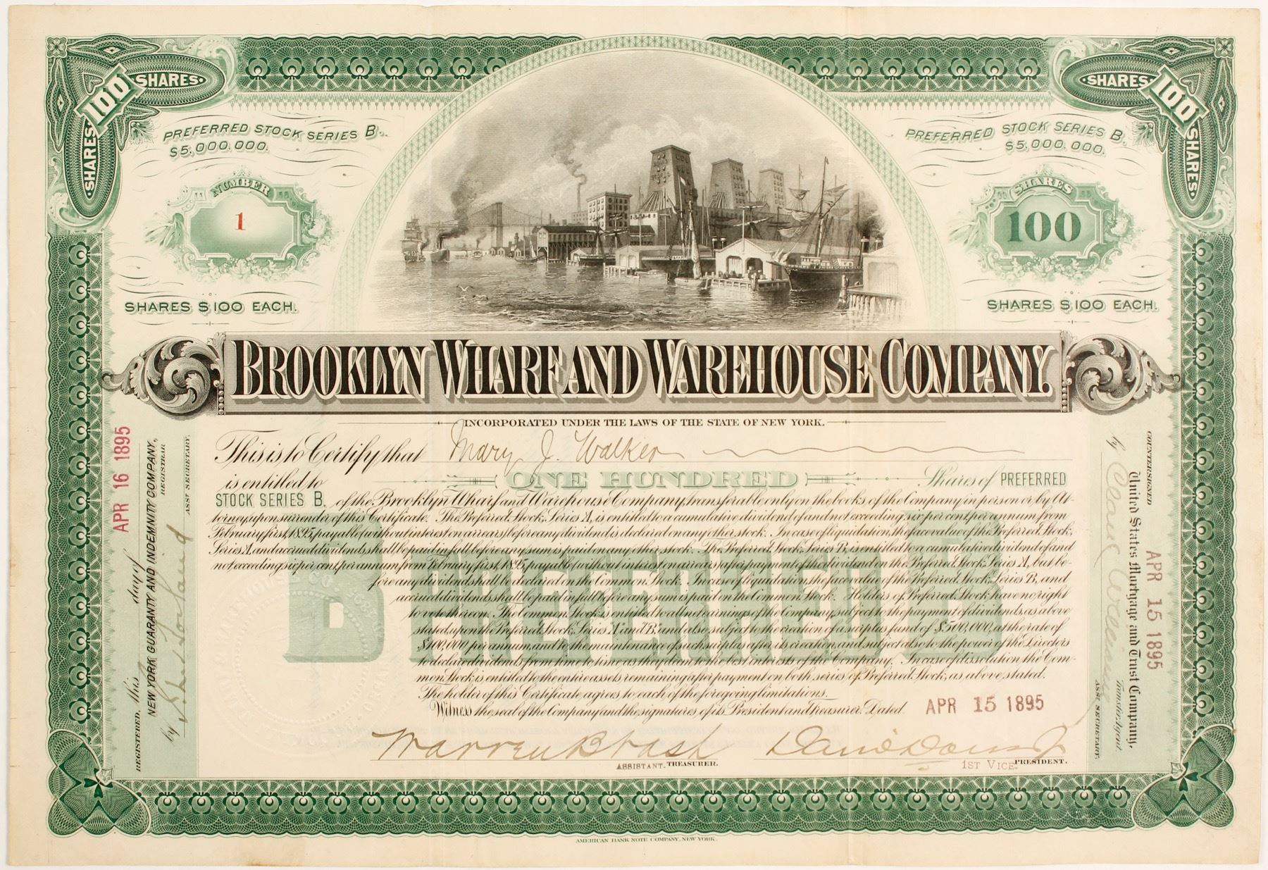I/U #1 Mary Walker 100 shares 1895 signed by VP Davis. Inc in NY. NYC waterfront vignette. Prag Collection. State: New York City: Date: 1895 HWAC# 83412