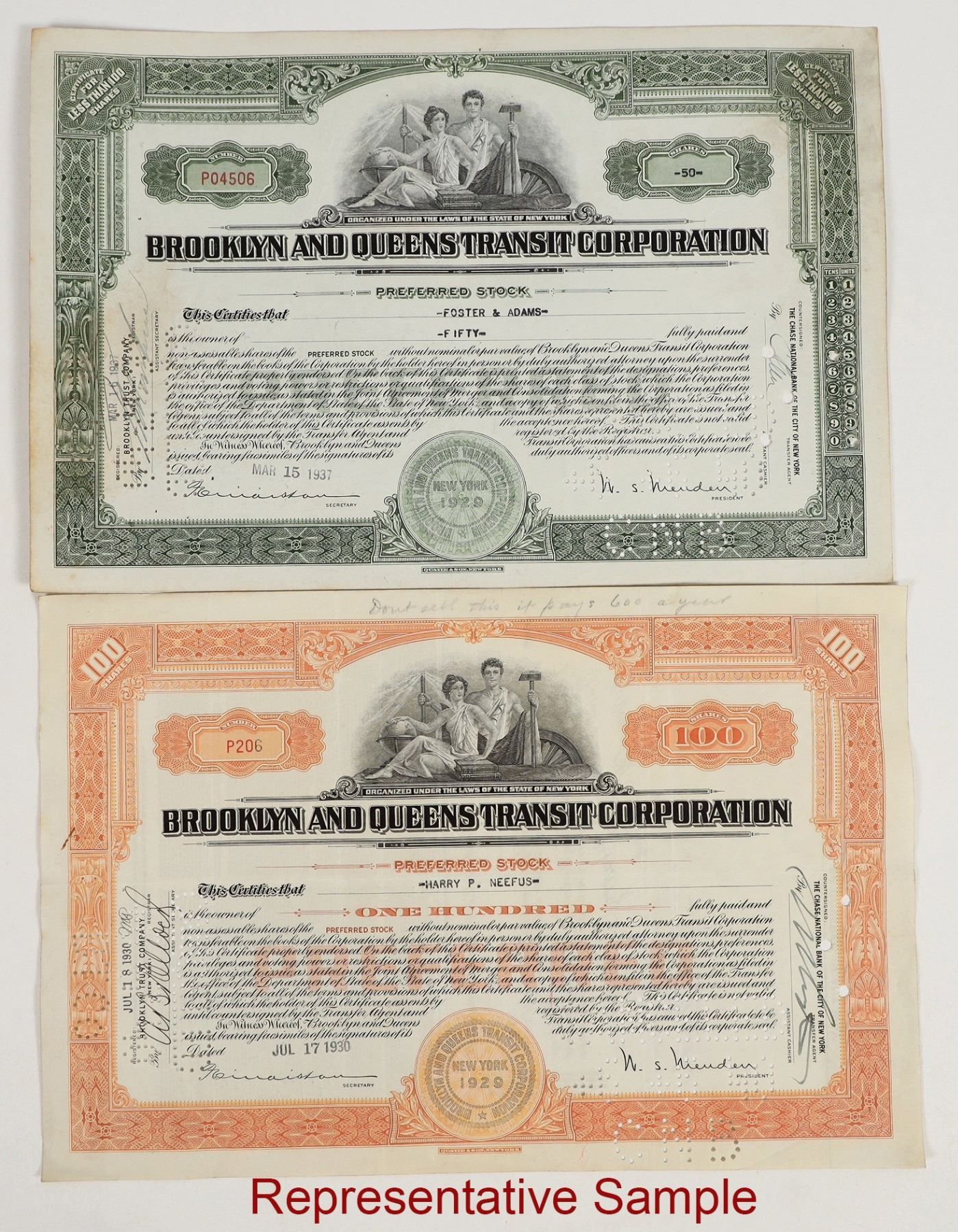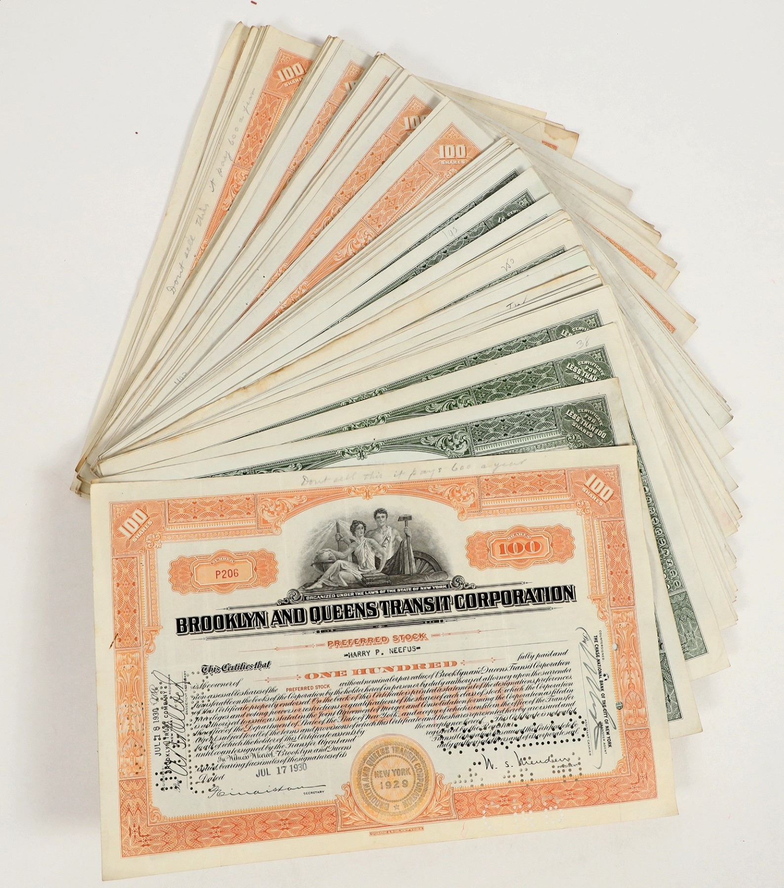 80+. I/C. Issued 1930-40. VG or better. Brooklyn and Queens Transit Corp. , Quayle & Son printer. "CANCELED" hole punched .