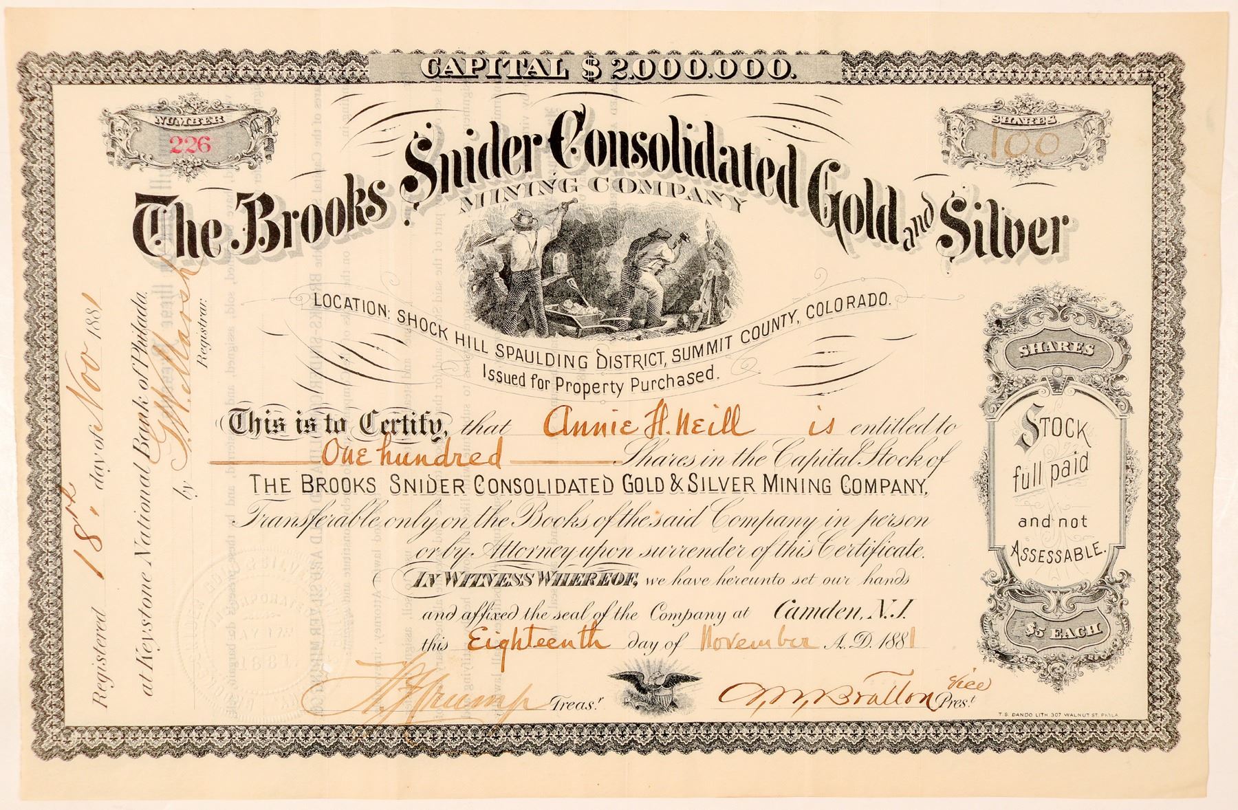 Location: Shock Hill, Spaulding District, Summit County, Colorado. (printed under vignette). Inc. in New Jersey. No. 226, issued for 100 shares to Annie Neill on Nov. 18th, 1881. Signed by the vice-president and treasurer. Not cancelled. Ornate stock with fancy title and underground mining vignette. Printed by T.S. Dando Lith., Philadelphia. Folds, hole in seal, otherwise very clean. 8 x 12" Owned three claims: the Illinois, Fannie Barrett, and Peerless, situated on the west slope of Shock Hill, one mile from Breckenridge. Discovered in August 1880. Developed by 300 ft. of surface workings and drifts. Also owns a 20 stamp mill. Ore body is a deposit 35 feet thick, lying on the surface, quartzite and sulphides. Assays at $10-100 gold and 50-250 ounces silver per ton. [Ref: 1883 CO Mining Directory, pgs. 756-57] () Ken Prag Collection