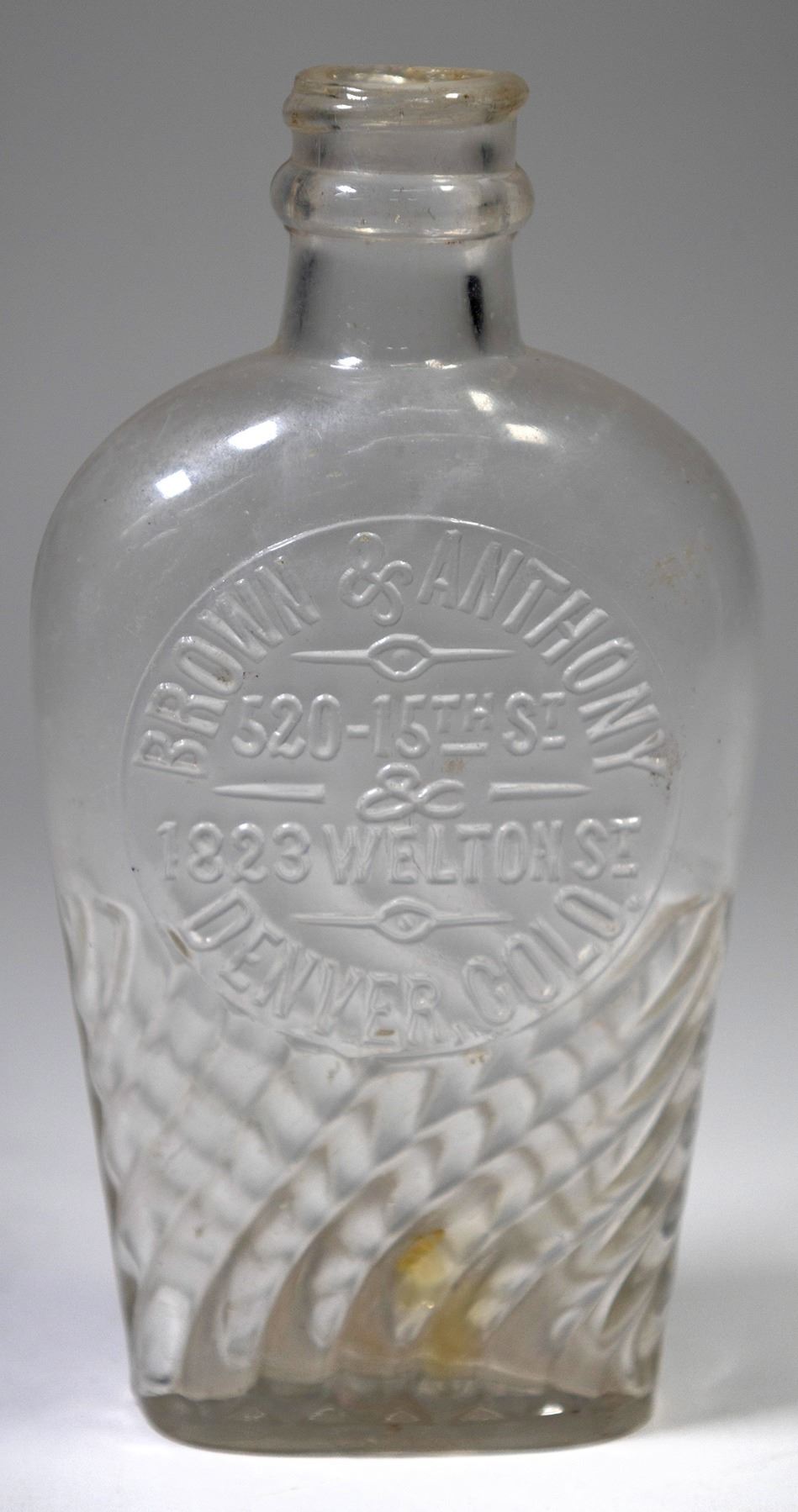 Clear coffin bottle. Brown & Anthony/520-15th St./1823 Welton St./Denver, Colo. Ground screw top. 6". Internal flash. No apparent chips or cracks.