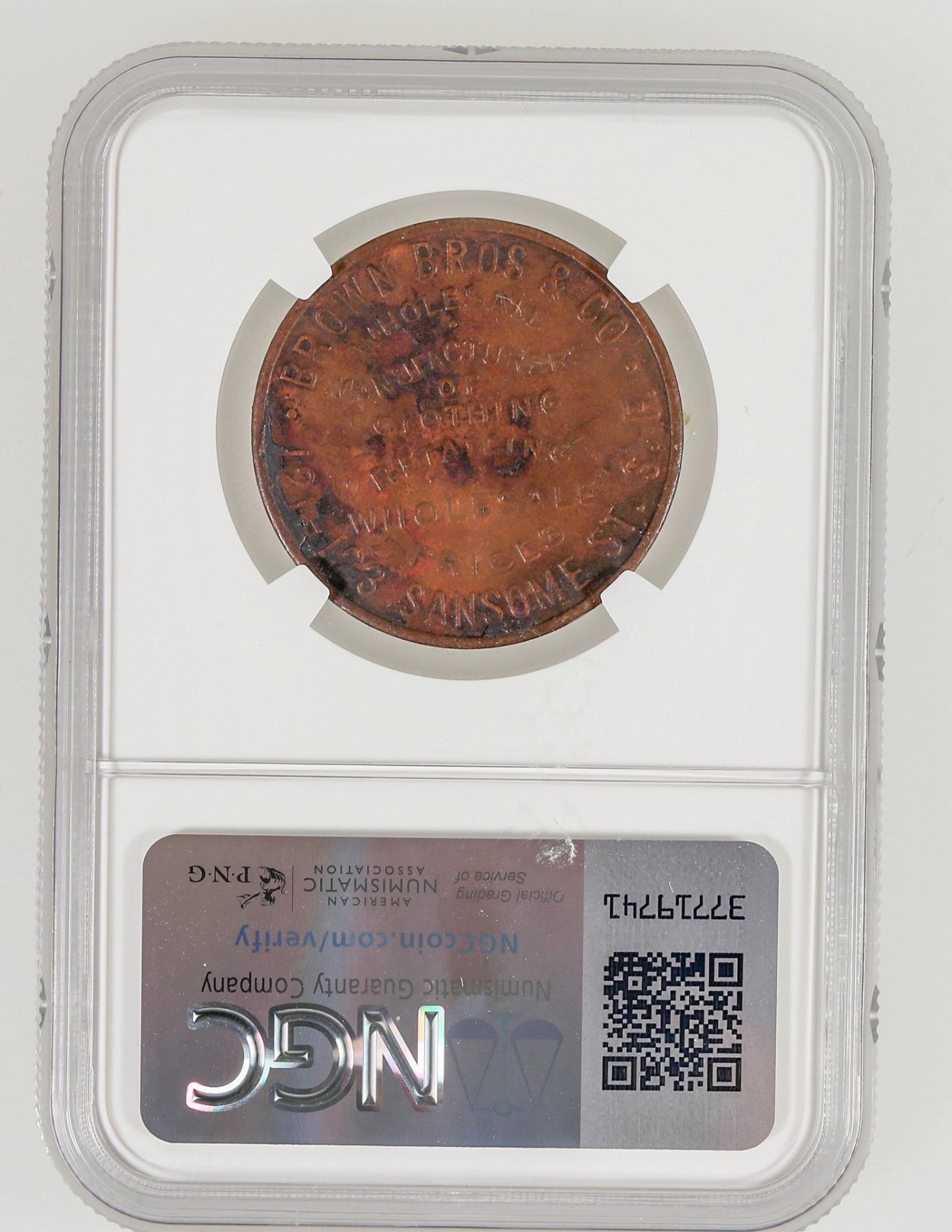 BROWN BROS & CO / WHOLESALE / MANUFACTURERS / OF / CLOTHING / RETAILING / AT / WHOLESALE / PRICES / 121-123 SANSOME ST. // SILVER SAVING SALE / (eagle) / SOUVENIR (no period after BROS) C, rd., 31 mm.