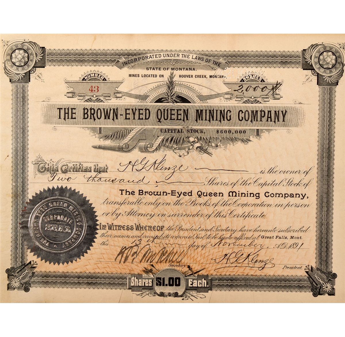 Incorporated in Montana. Cert. #43, issued in 1891 at Great Falls, Montana for 2,000 shares to H.G. Klenze and signed by Klenze as president. The signature of the secretary is illegible. No vignette with silver corporate seal. Black and orange on white. 10î x 7.75î. Mines Located on Hoover Creek, Montana printed at the top. Large tears at the bottom repaired archaically on the reverse. Foxing and heavy folds. VG Date 1891 Great Falls, MT hwac 54028