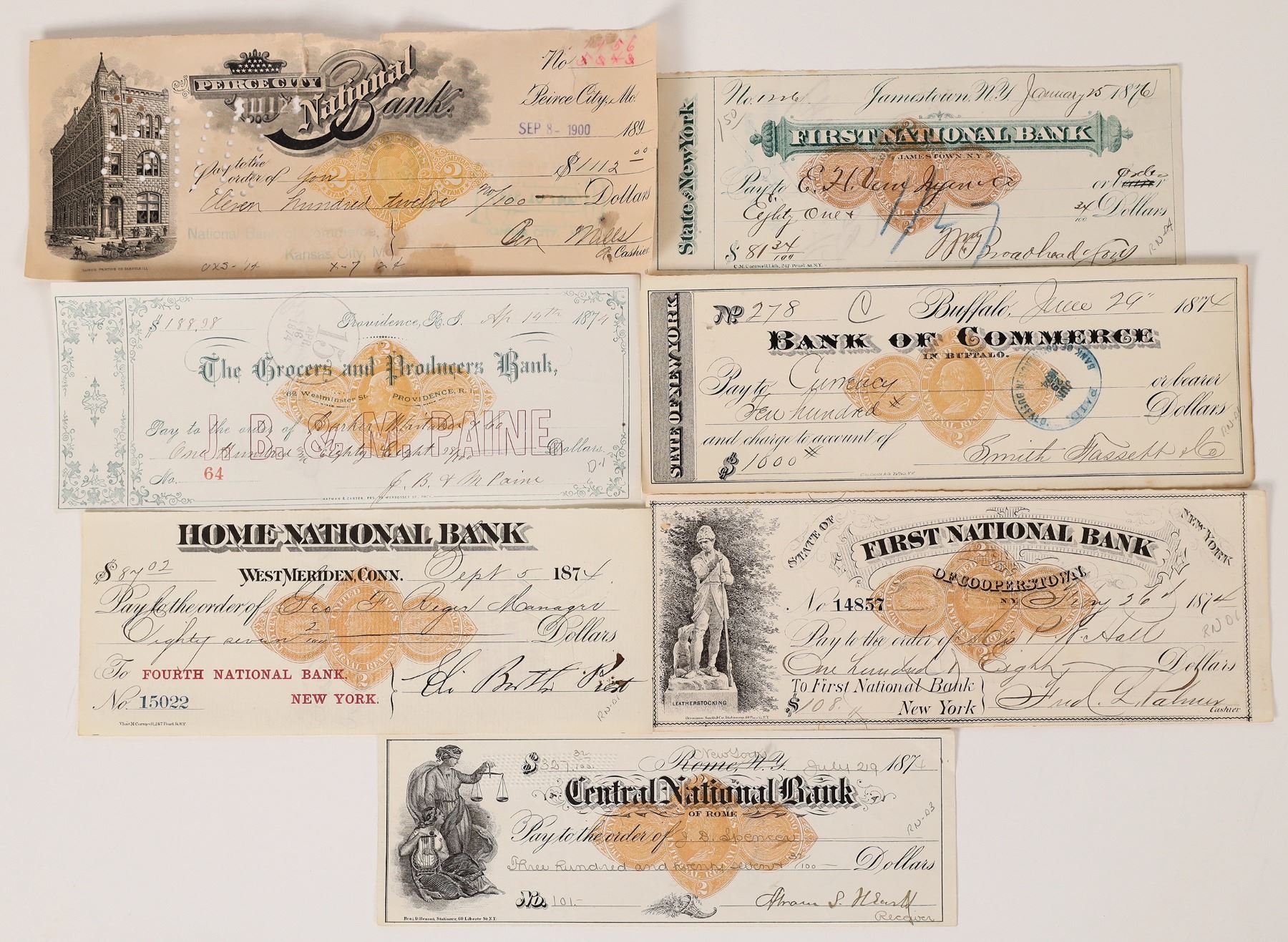 7 brown RND checks, c. 1874-1900. The citrine yellow color of RNX is recognized but not the much rarer browns of the RND imprints. They should be. Here is a wonderful group of rare brown RND's other than those I regularly list from Nevada. This lot includes a rare bright yellow RNX in poor condition.