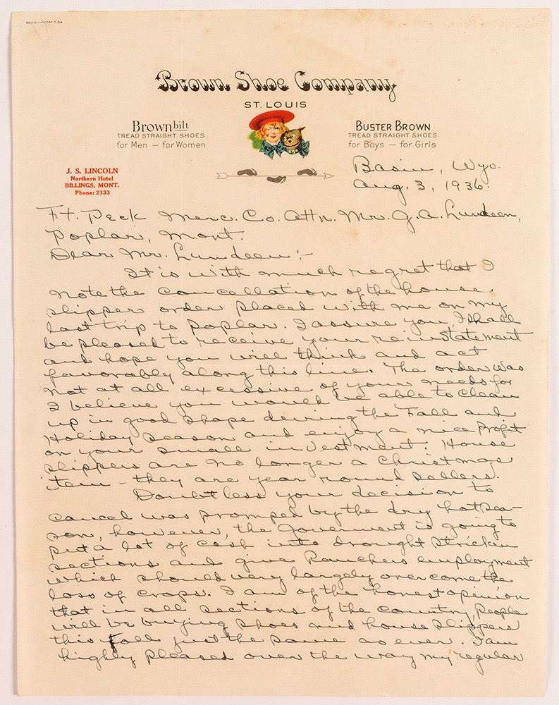 Illustrated lettersheet for Brown Shoe Company, datelined Basin, Wyoming, Aug. 3, 1936. Sent to Ft. Peck Mercantile Co. in Poplar, MT. Letter is about cancelling an order of house slippers. First page only. 11" x 8.5" HWAC# 50636 Date: Location: Poplar, Montana