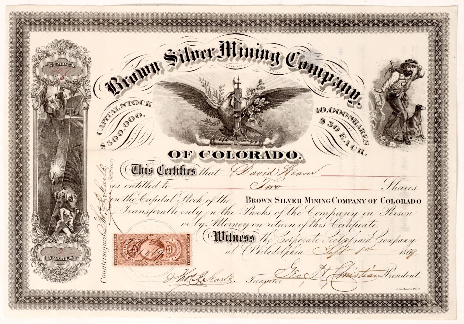 Stock certificate #307 from the Brown Silver Mining Company issued to David Weaver for two shares at $50 per. It is signed by company president George Christian and Thomas Searles, secretary. Attached is a 25 cent Red George Washington Revenue stamp. In nice condition. The Brown company displayed their first silver bullion bar in Findlay, Ohio worth $162.87. In December, 1869, the Brown Co. displayed a 683 troy ound silver bar, the largest yet made at Georgetown. Georgetown Colorado