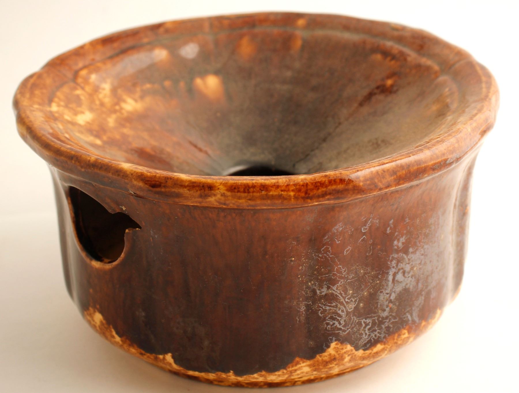 Brown spittoon, 4.5x8.25". Side drain hole has .5" chip