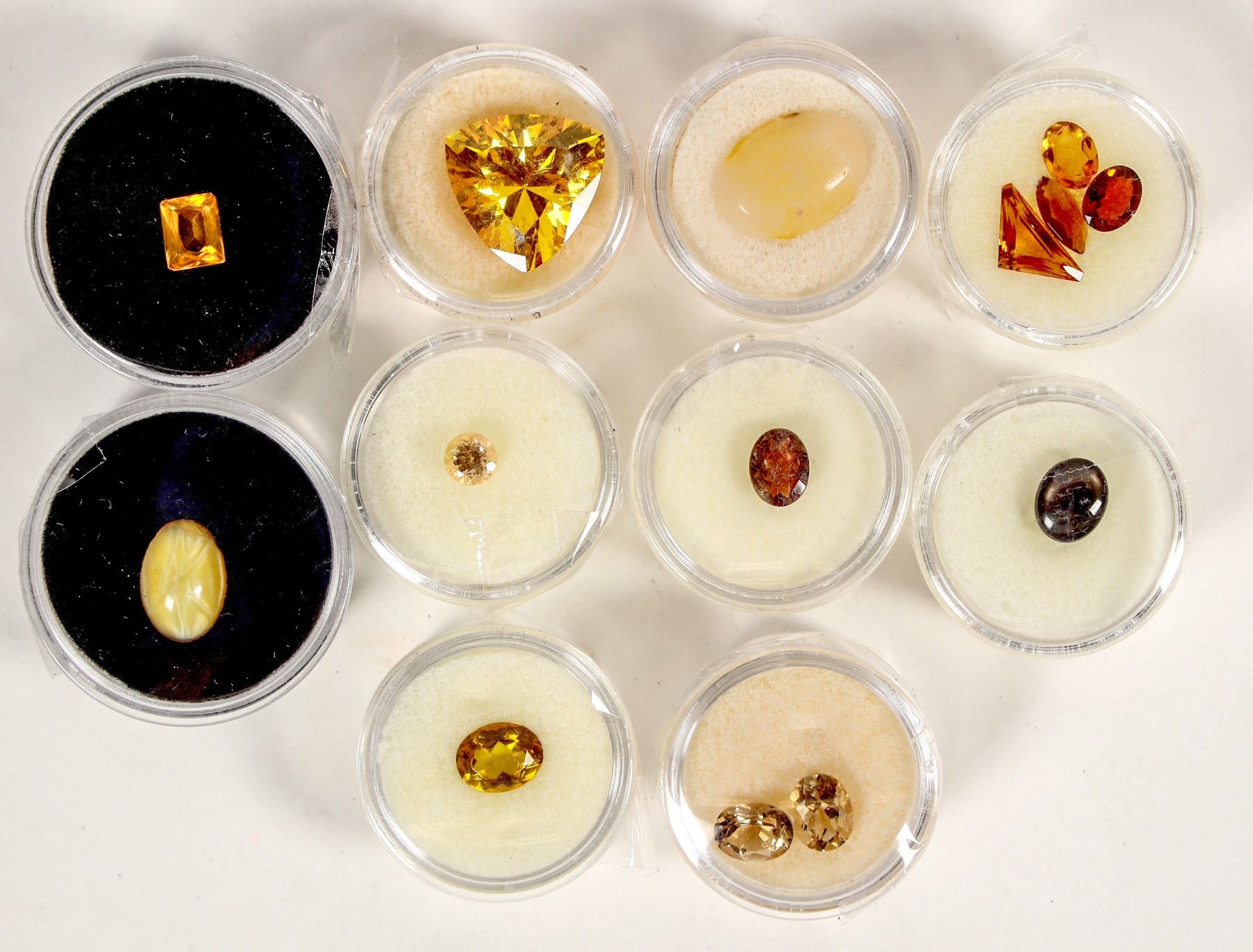 Brown Toned Faceted Stone Group. Ten Different Facet Cuts of Gemstones, most 1 ct to 8 cts. Good variety of color. Some artificial. Includes, green amber, cubic zirconia, yellow jade, garnets, andalusite and more. Very attractive. Please inspect, an excellent lot.