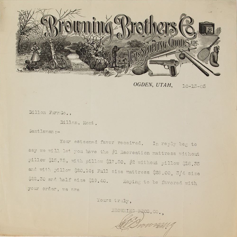 The business known as the Browning Arms Company was officially organized in Ogden, Utah, under that name in 1927. The business started in as the1872 the Browning Brothers Company, Arms and Sporting Goods, with its shop and retail store in Ogden. Among the most famous guns they produced were the 45-caliber pistol; the 1895 Colt Peacemaker machine gun; the Browning automatic rifle; a variety of 30- and 50-caliber machine guns used in World War II; and the Browning Automatic-5 shotgun. Signed by G E Browning. State: Utah City: Ogden Date: 1905 FHWAC#: 42815