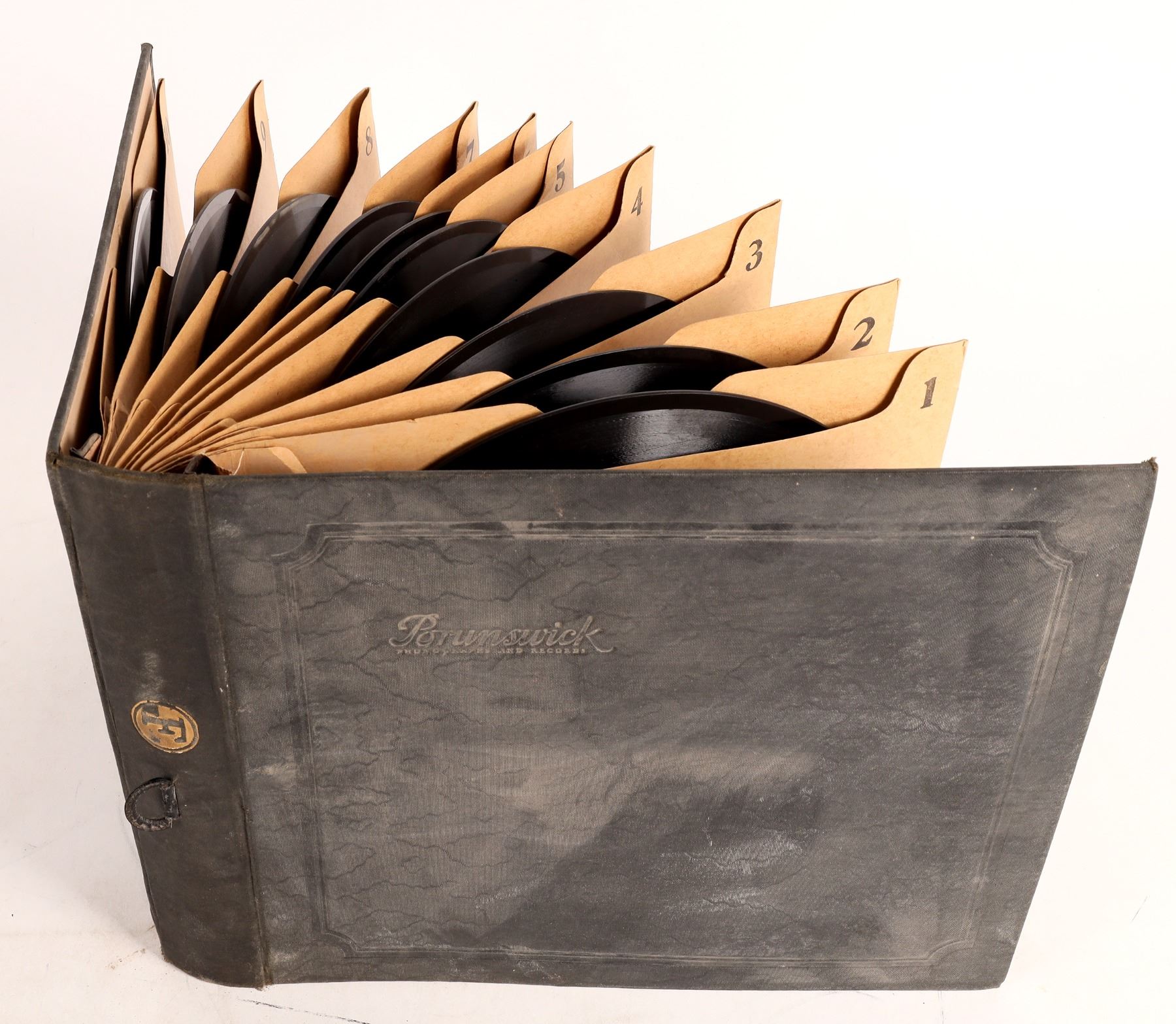 10 Brunswick-Blake-Collender records in a binder. Charley Straight, Ben Bernie, Harold Stern, Colonial Club Orchestra, Harry Richman, The Clevelanders, Hal Kemp etc. 10". Visual grading shows some scratches.