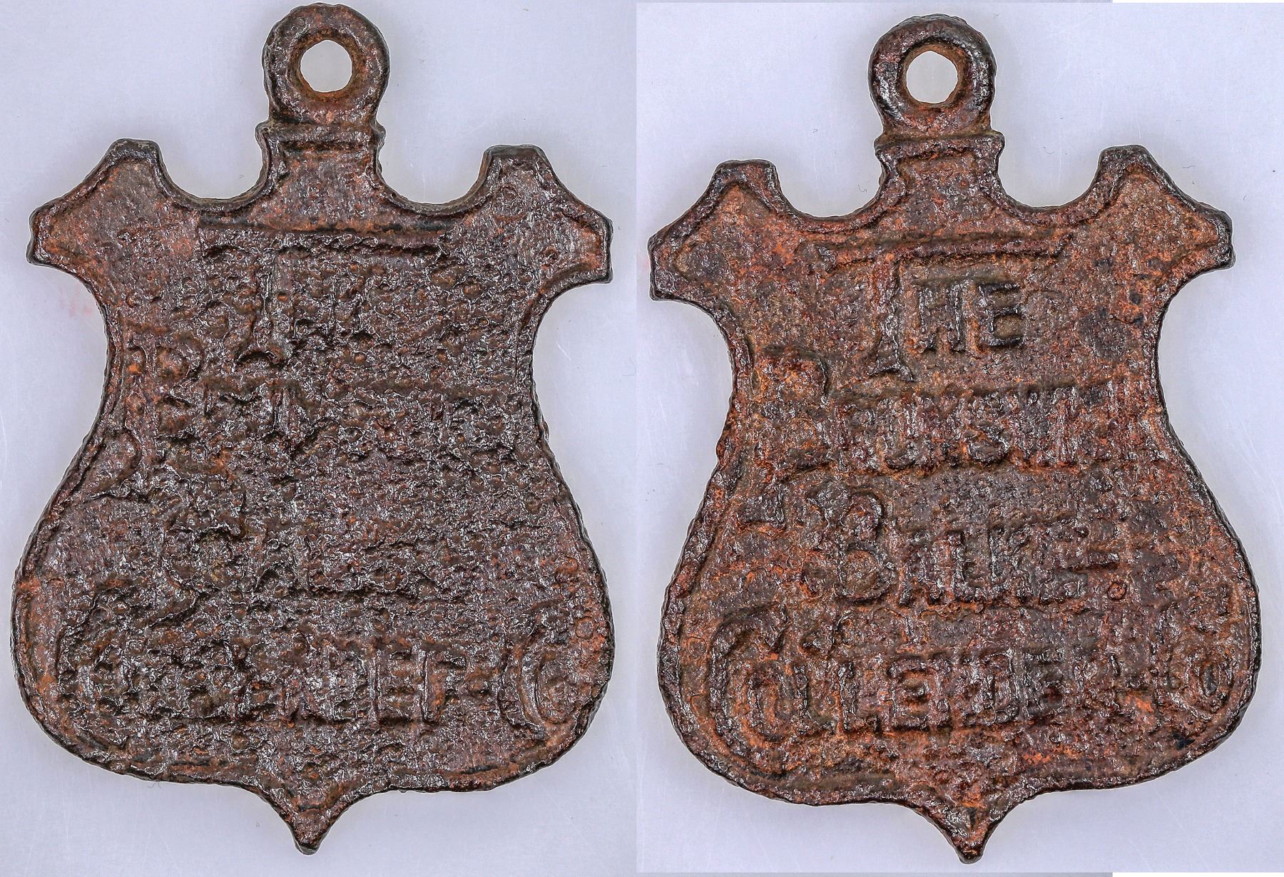 Brass hanger, 3 x 2 1/2 inches with Brunswick Balke Collender engraved on both sides. Cast iron counterweight for Brunswick chalk holding system popular at the end of the 19th century. Original black enamel finish remains fairly intact.