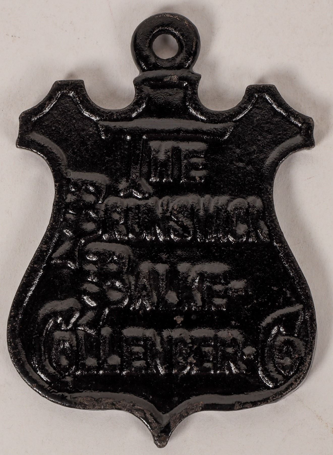 Rare embossed badge shaped metal with "The Brunswick-Balke Pool Table Collender" 2.5" x 3.25" early 1900's