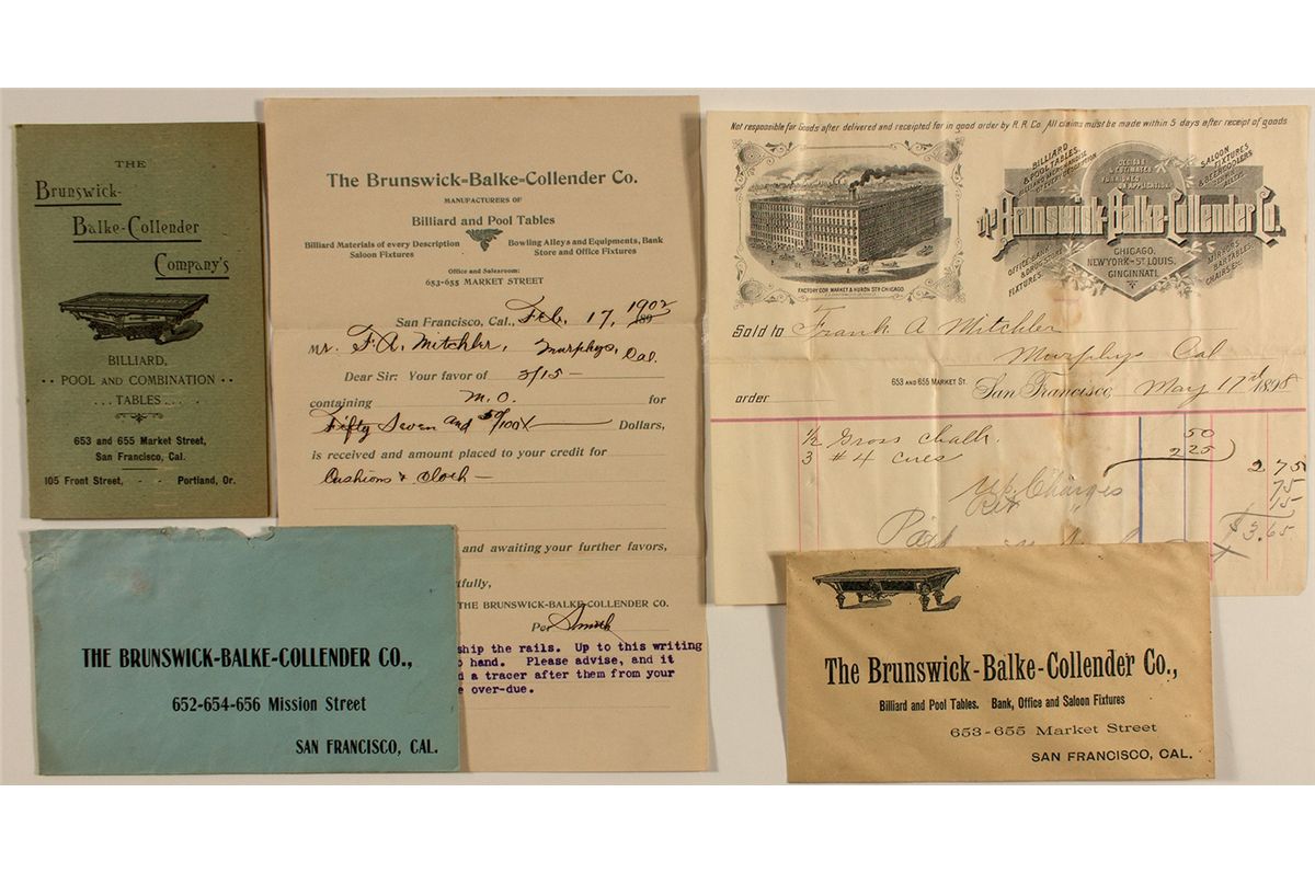 This is a must for any Brunswick-Balke token collector. 1898 and 1902 billheads. Both different. Both to Frank Mitchler at the Murphy Hotel. Two unused return envelopes. Two different addresses - although they are across the street from each other. One has a pictorial advertisement. GREAT lot!City: San FranciscoCounty: San FranciscoState: CADate: