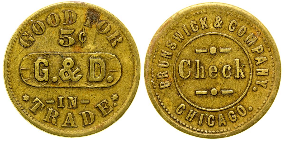 Unlisted in Rubick. Brunswick & Company / Check / Chicago // GF / 5c / G. & D. / IT. Round, brass, 24mm. (Svoboda Collection) City: Sumatra State: Montana Date: HWAC# 35068