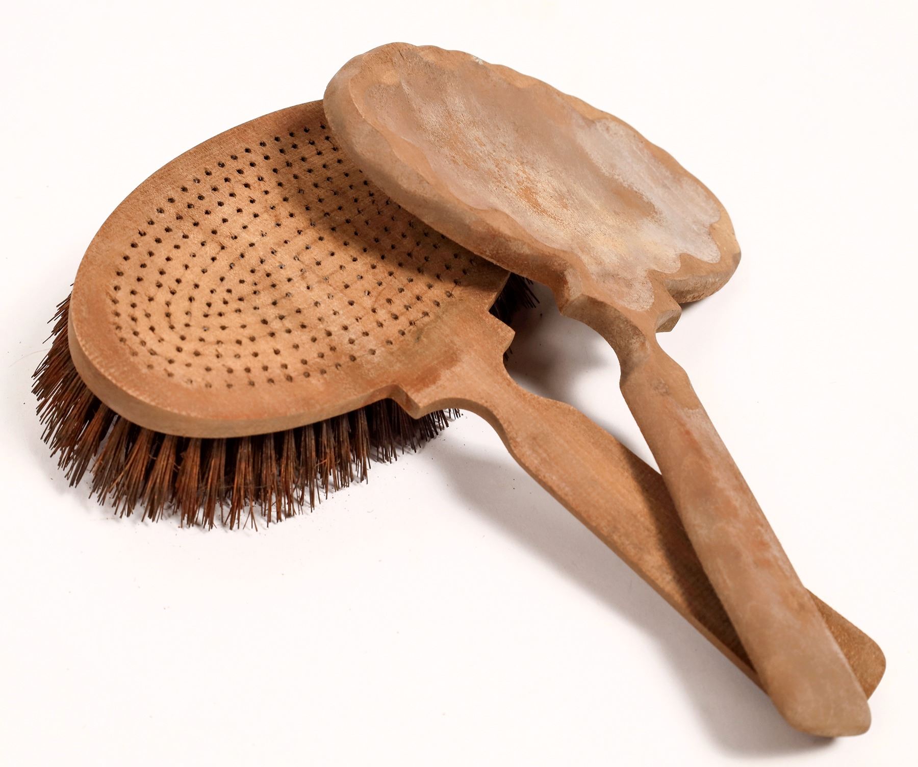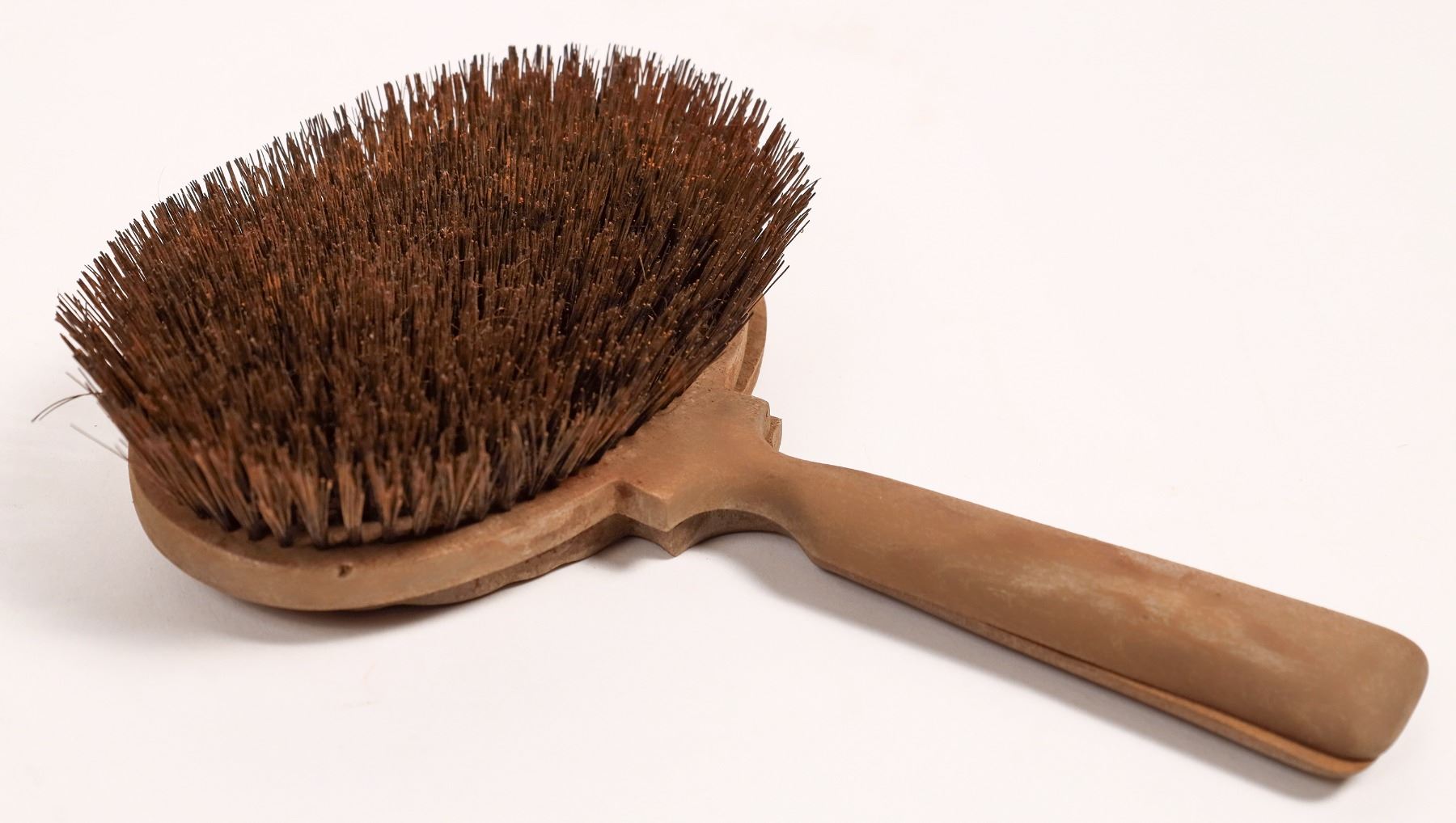 Wood handled brush from the Easton trunk. Oval brush with handle. Scalloped design on back of brush. Bristles are all intact in the brush. Brush is approximately 3.25 inches x 5 inches x 1.5 inches. Handle approximately 4.25 inches x .75 inches x .50 inches. Base of brush is in two pieces. No damage.