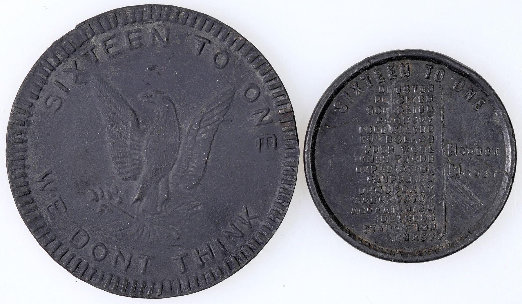 Two examples of political satire: 1) Bullion Value / Liberty Head / 1896 // Sixteen to One / eagle / We Don't Think; pot metal, rd., 64 mm. 2) Free Silver / One / Dime / 1896 // Sixteen to One / Bluster / Populism / Socialism / Anarchy / Free Silver / 50c Dollar / Free Wool / Free Trade / Repudiation / Pauperism / Democracy / Bankruptcy / Agrarianism / Idleness / Starvation / Lunacy / Honest /Money; pot metal, rd., 47 mm. During the 1896 and 1900 elections, William Jennings Bryan argued for a bi-metal standard of gold and silver, 16 ounces of silver for every ounce of gold. William McKinley wanted the gold standard preserved, and his supporters issued Bryan Money as a political statement.