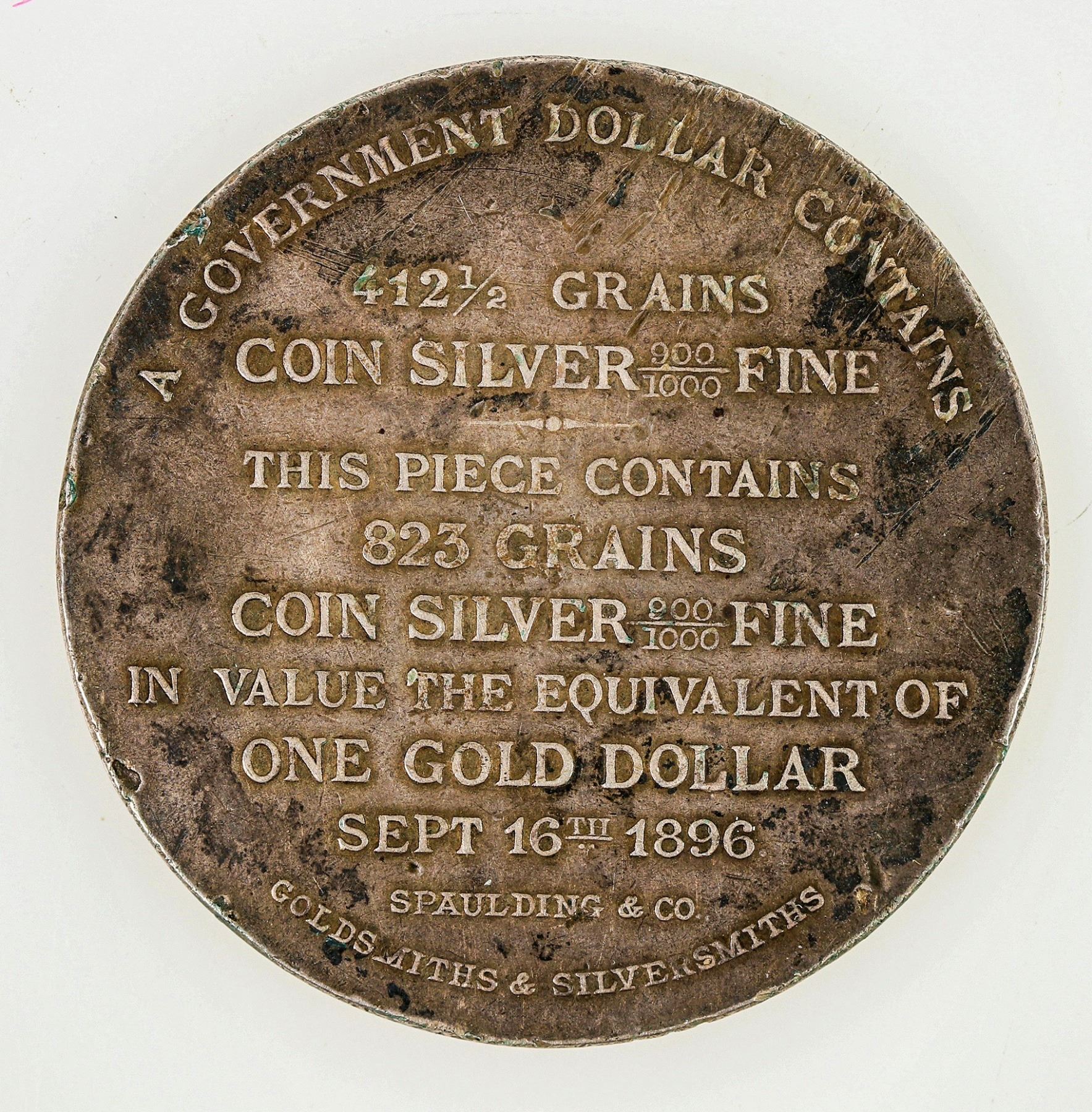 Obv. In nine lines, first curved, others straight, A Government Dollar Contains / 412 1/2 Grains / Coin Silver 900/1000 Fine / This Piece Contains / 823 Grains Coin Silver / In Value the Equivalent of / One Gold Dollar / Sept. 16th 1896. / Spaulding & Co. No rim.