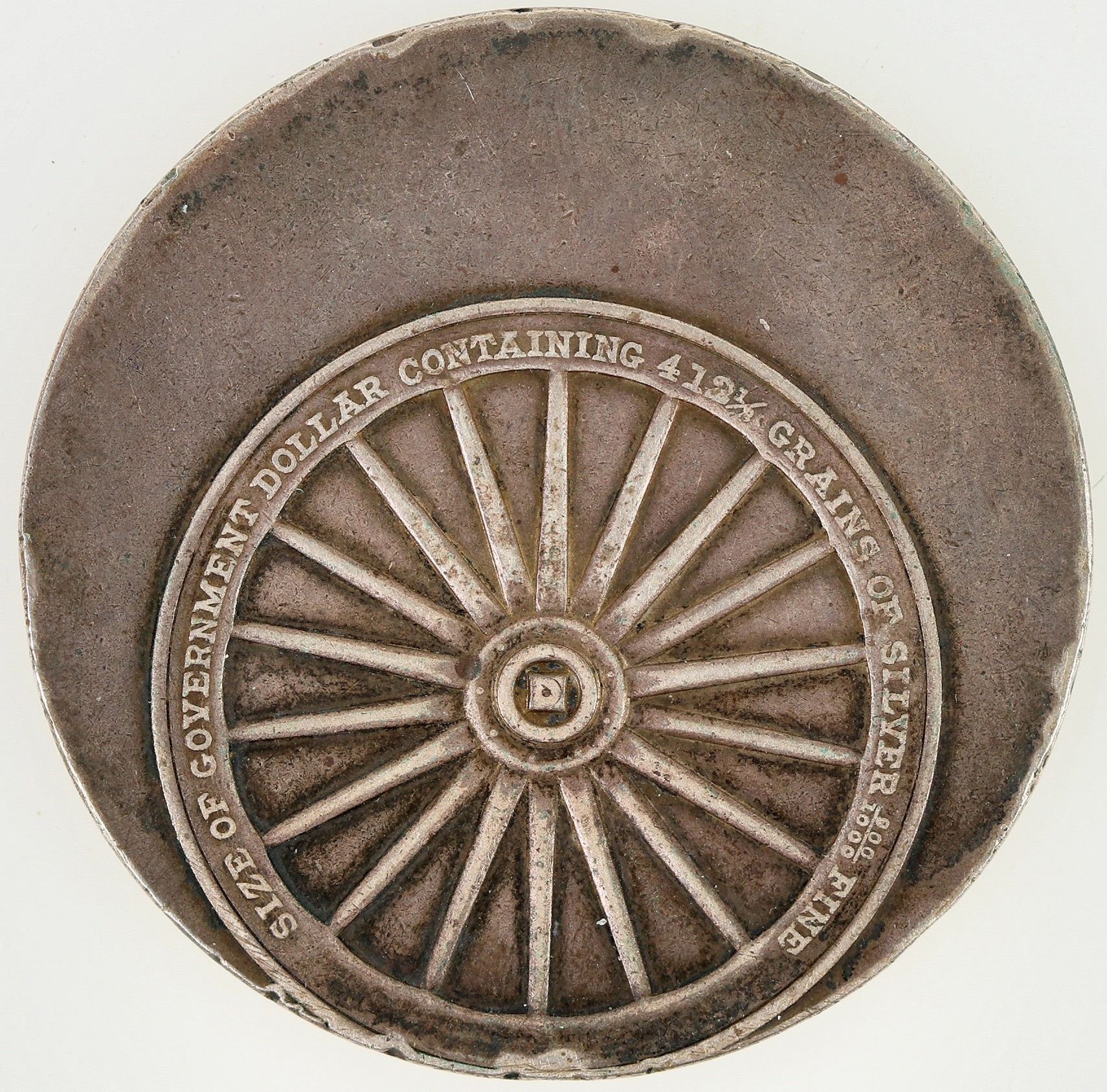 Rev.: On rim of cartwheel, which springs from bottom edge, Size of Government Dollar Containing 412 1/2 Grains of Silver 900/1000 Fine; no rim. Silver. 52mm. Schornstein 16.