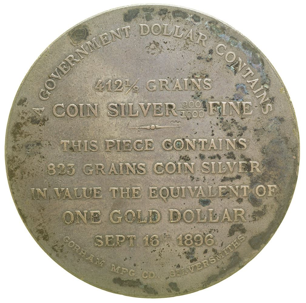 Schornstein 7. Obv.: A Government dollar contains / 412 1/2 grains / coin silver 900-1000 fine / This Piece Contains / 823 grains coin silver / In Value the Equivalent of / One Gold Dollar / Sept, 16th 1896 / Gorham Mfg. Co. Silversmiths. Rev.: Blank. City: State: Date: HWAC# 51868