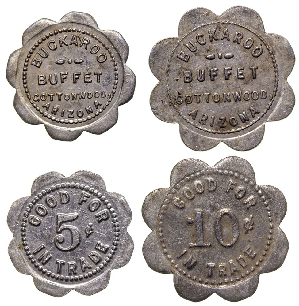 Lot of 2: 1) Obv.: Buckaroo / Buffet / Cottonwood / Arizona; Rev.: Good For / 5c / In Trade; Al., 21mm, scalloped, R6; 2) similar, 10c, 25mm, scalloped, R6.