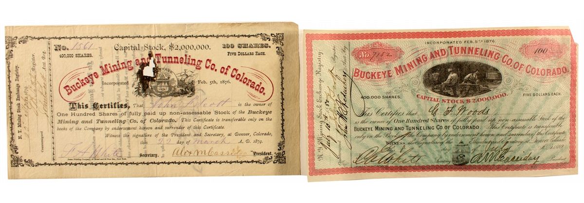 Two different certificates from this company. 1)Buckeye Mining and Tunneling Co. of Colorado incorporated on February 5, 1876. Colorful stock. No. 7152 issued to C. F. Woods by C. E. White, Secretary, and A. M. Cassidy, President, on 8 July 1880 for 100 shares. Countersigned by the N. Y. Mining Stock Exchange Registry on 10 July by the registrar and the assistant registrar. A smaller-sized stock. U/C. Signed on reverse by Woods and a witness on 13 July 1880. The company owned “the Silver Cliff Mine with assays of $20-75/ton. Large masses of cerargyrite (silver chloride = 75%) [or horn silver] of this ore were mined near the surface which yielded 30-50 oz/ton.” Silver Cliff, which was founded in 1878, had a “population of 5,000 with 29 grocery stores, two banks, three fine hotels, three dance halls and 25 saloons” by 1880. Alex M. Cassidy purchased “oil claims at Oil Springs, Fremont County,” in 1862, and “sunk six wells that were moderately profitable.” He then turned to mining [Ref: Western Americana Auction # 9, Volume 2: Colorado, p. 34, 2001]. Tiny piece missing from top right corner. 2)Buckeye Mining and Tunneling Co. of Colorado Cert. #1561, issued in 1879 to John F. Scott and signed by the same company officers. Colorado state seal. Burn hole thru center. Issued for 100 shares. Uncancelled.City: Silver CliffCounty: CusterState: CODate: