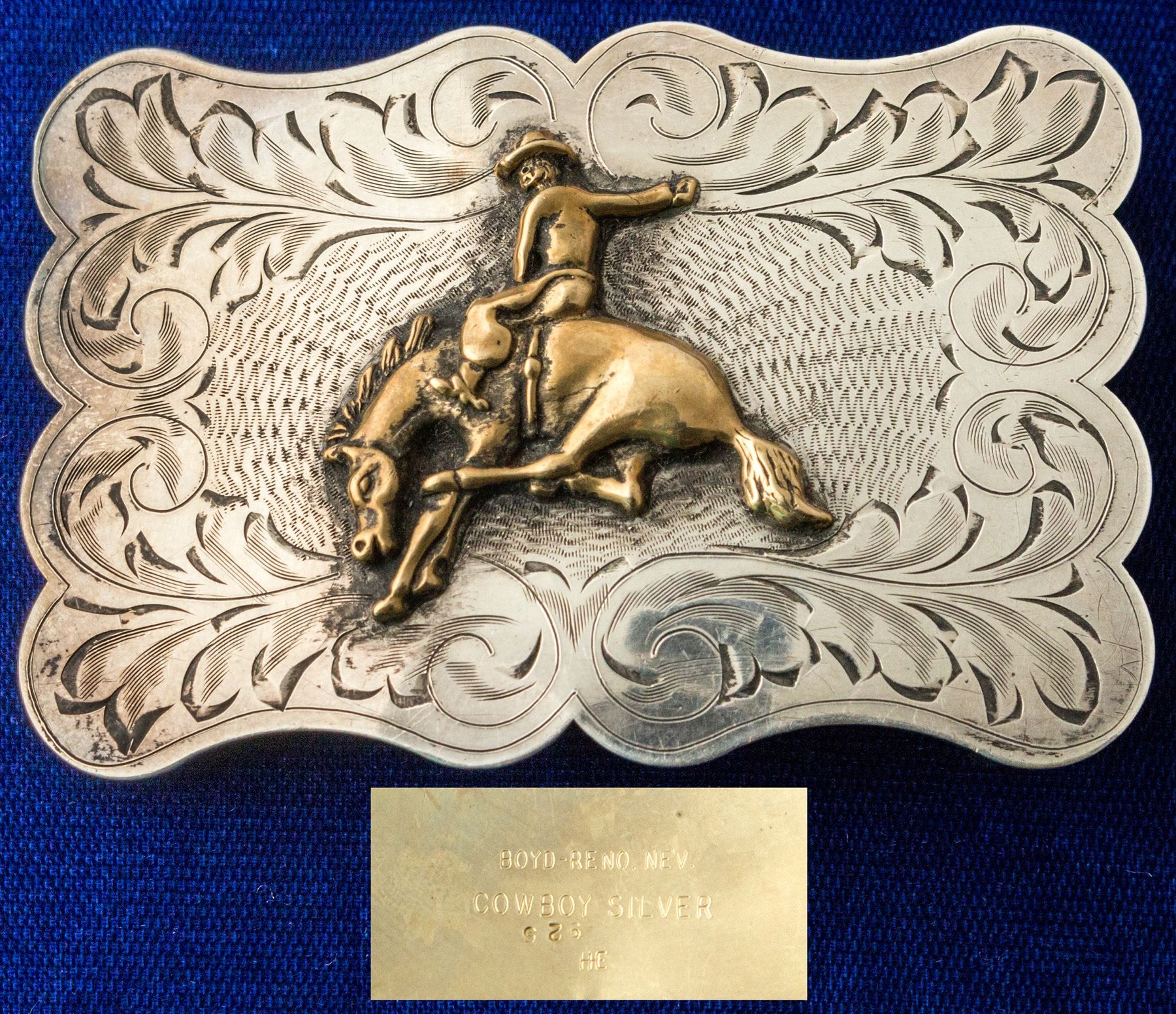 Scrolled edges rectangular western etched sterling silver belt buckle. Depicts a gold cowboy on a gold bucking bronco overlay front and center. (14K?) Belt buckle is in excellent condition. Stamped on the back of the belt buckle says "Boyd Reno NV, Cowboy Silver 925". Size: 3" x 2". Weight: 42.3 grams. State: City: HWAC#: 47951 Date: