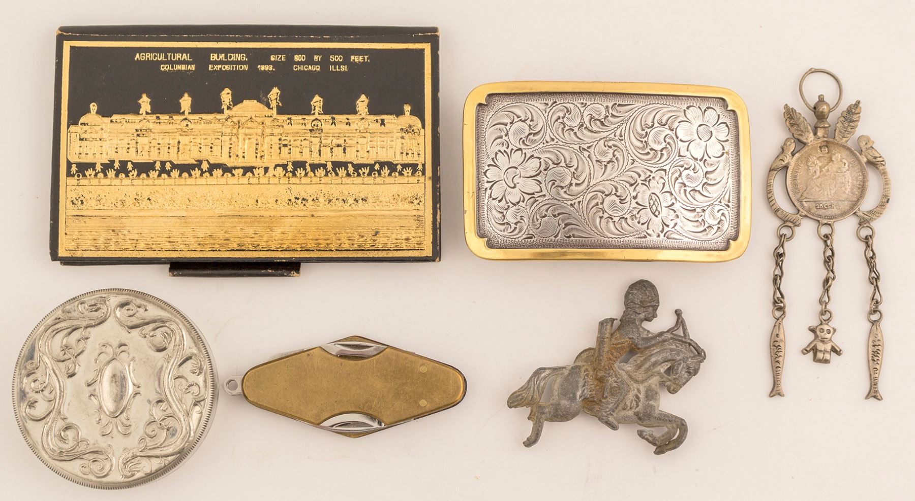 This is a nice little collectible set that includes a Sheffield snuff box, an Indian Chief Pin, an ornate belt buckle, and a pendant pocket knife /scissors. All are in very good condition and appear to be Victorian. Date: 1905 Location: HWAC# 571800