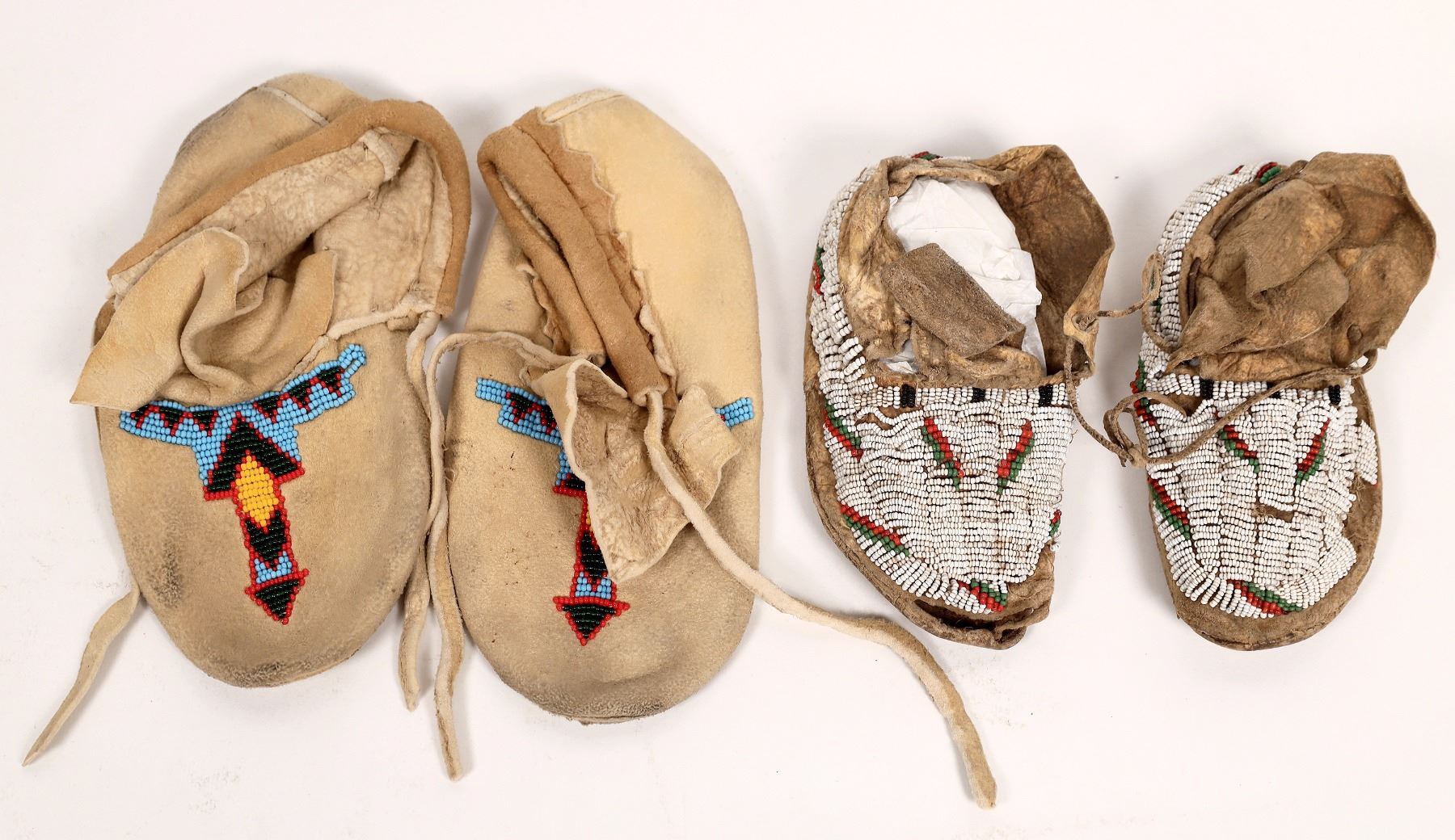 Child-size beaded buckskin moccasins. Smaller pair (c1880s) has a stiffer sole and could be buffalo hide. It is covered in lazy-stitched 13/0 glass beads in a white background with diagonal stripes of red and green beads and accents of dark blue beads around the tongue. Larger pair (c1950s) is entirely soft buckskin and a beaded applique design with black, red, yellow, and turquoise beads that appear to be modern due to their bright colors and uniformity.