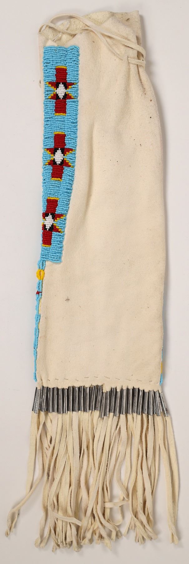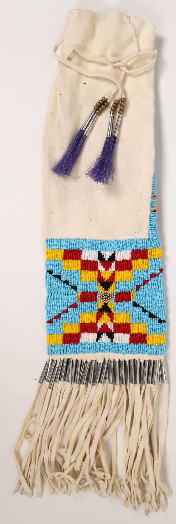 Modern buckskin pipebag with white metal cones and brass beads, purple dyed tassels and blue, white, black, yellow and turquoise beads by Louis Shaw. We could not find any info on him online. 24x5".
