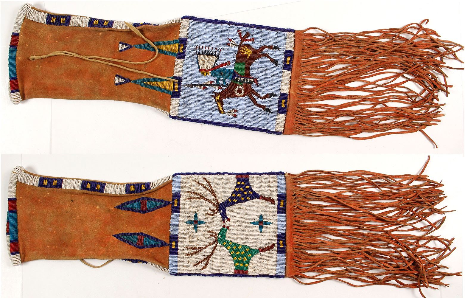 A beautiful buckskin pipe bag with beaded warrior on horseback motif on one side and twin deer design on reverse. Bag measures 19", 30" overall with fringe. Beading is very tight, with no visible damage. Color shows that it's not a contemporary design. Date: Location: HWAC# 56621