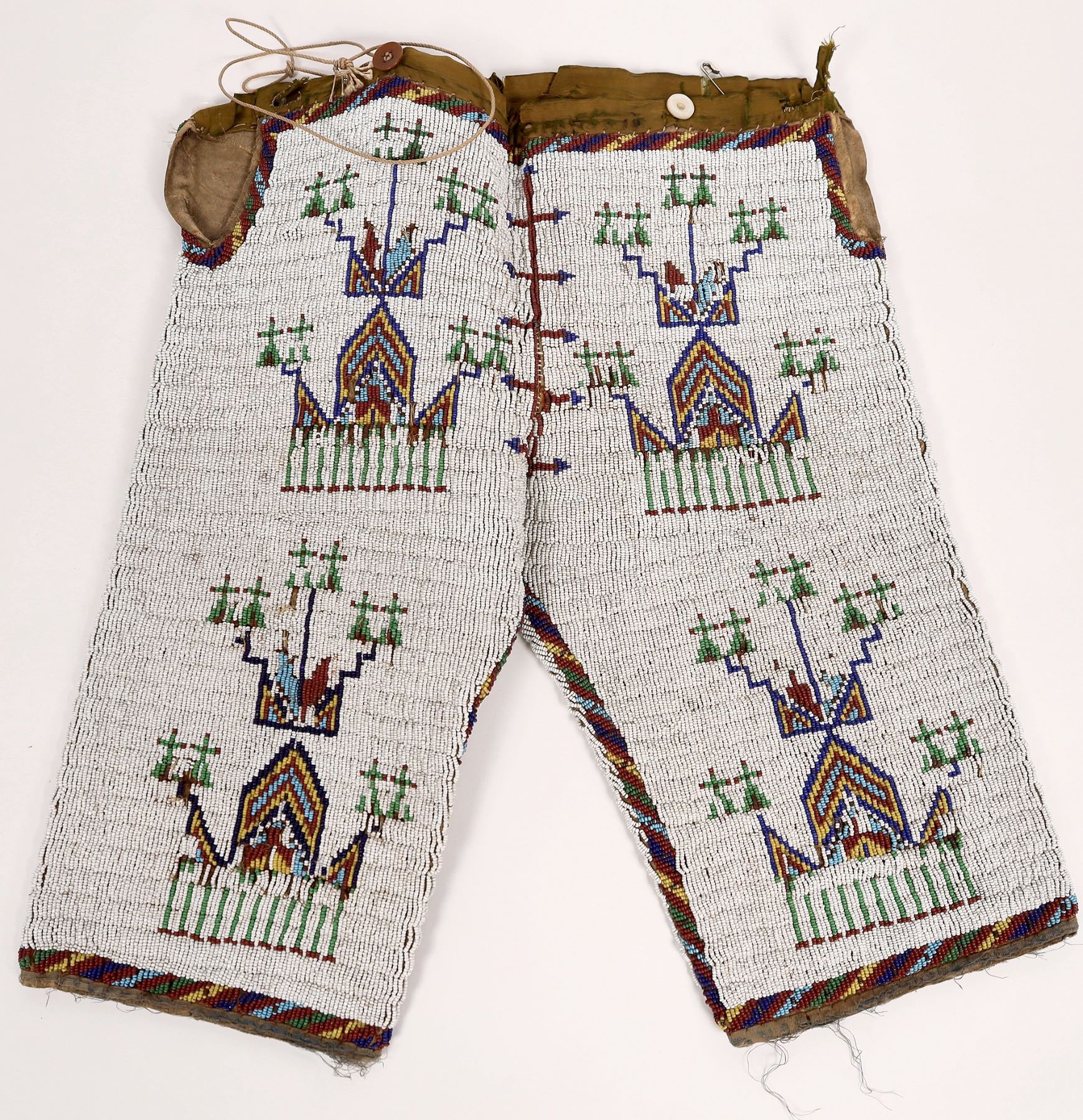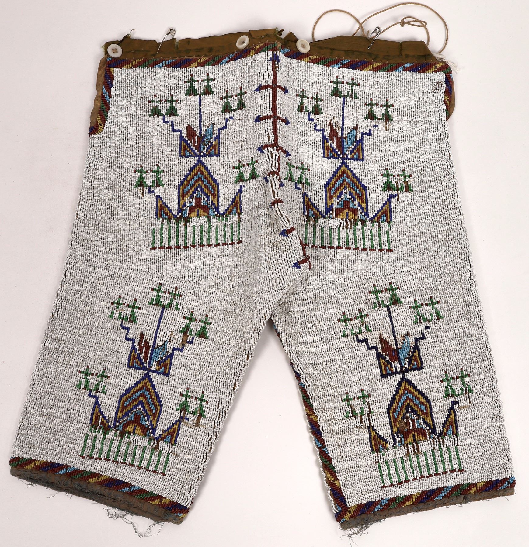 Hand-sewn buckskin short pants fully covered in a field of lazy-stitch white 12/0 beads with colorful Sioux designs in red, yellow, green, turquoise, blue, and some metallic beads. Mother-of-pearl and white glass buttons are at the waist. These would be quite heavy to wear and have no cloth lining. There are some rows of beads that are missing from wear, but overall this is a beautifully complete set of beaded shorts. 17 inches long, 15 inches wide at the waist, 10-inch inseam.