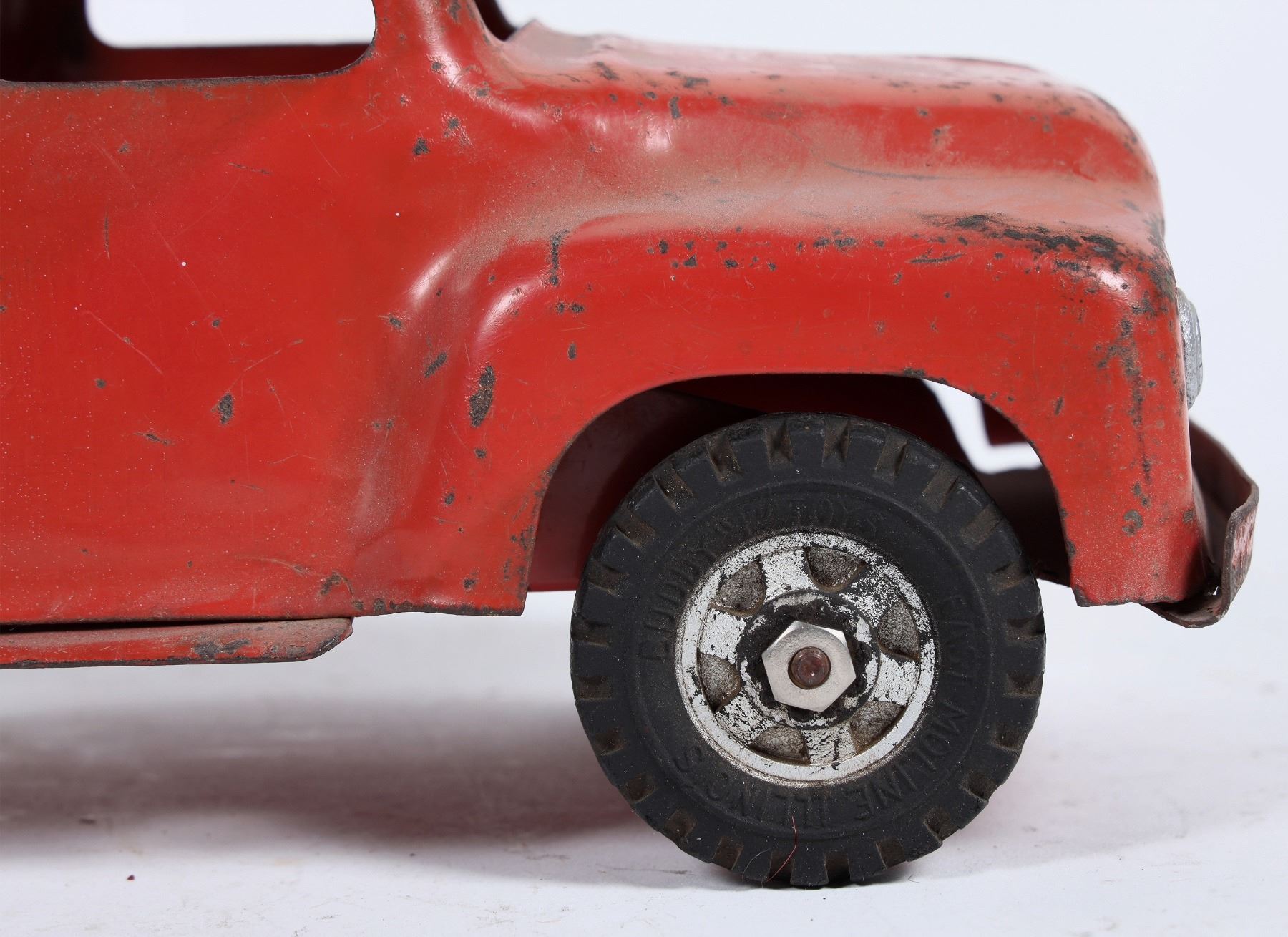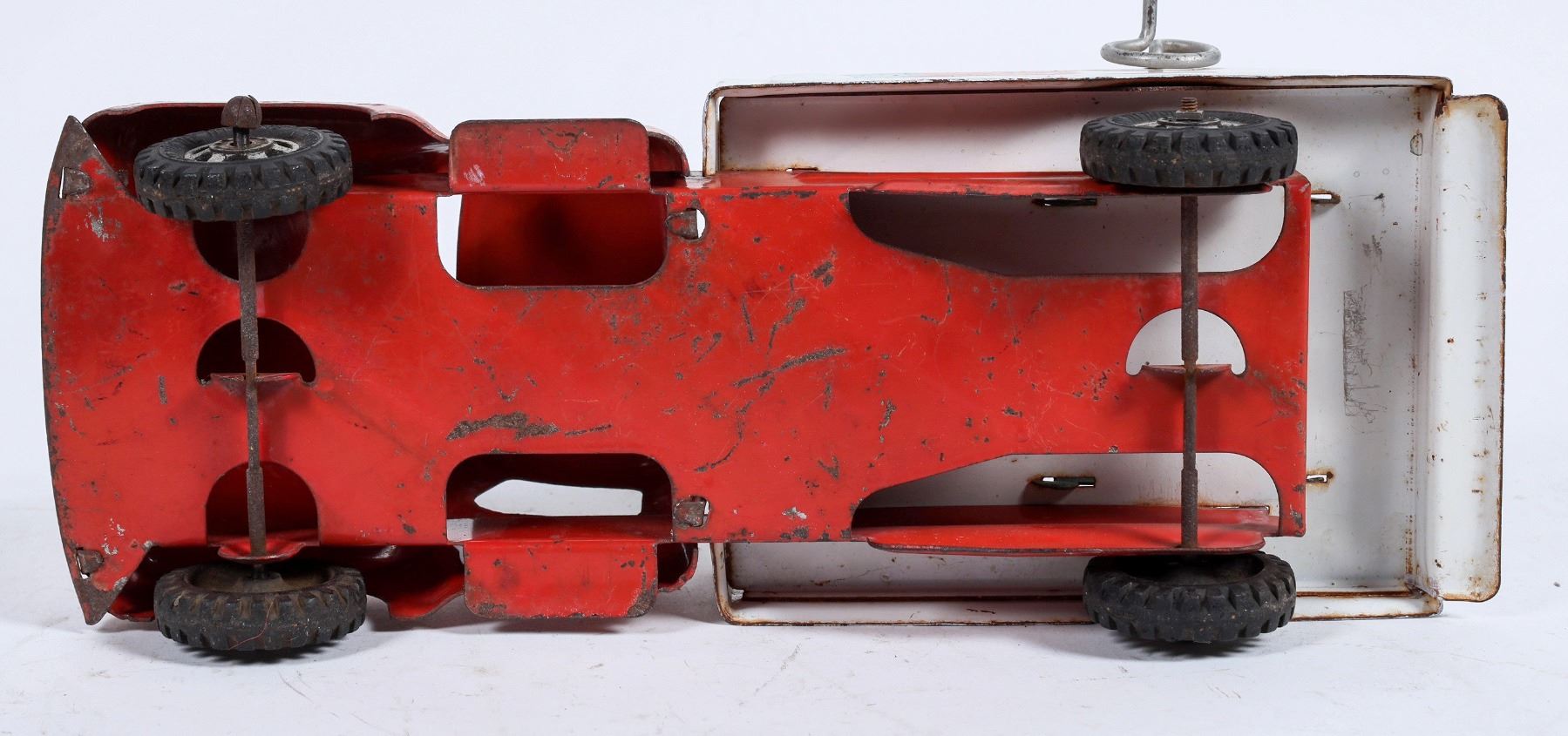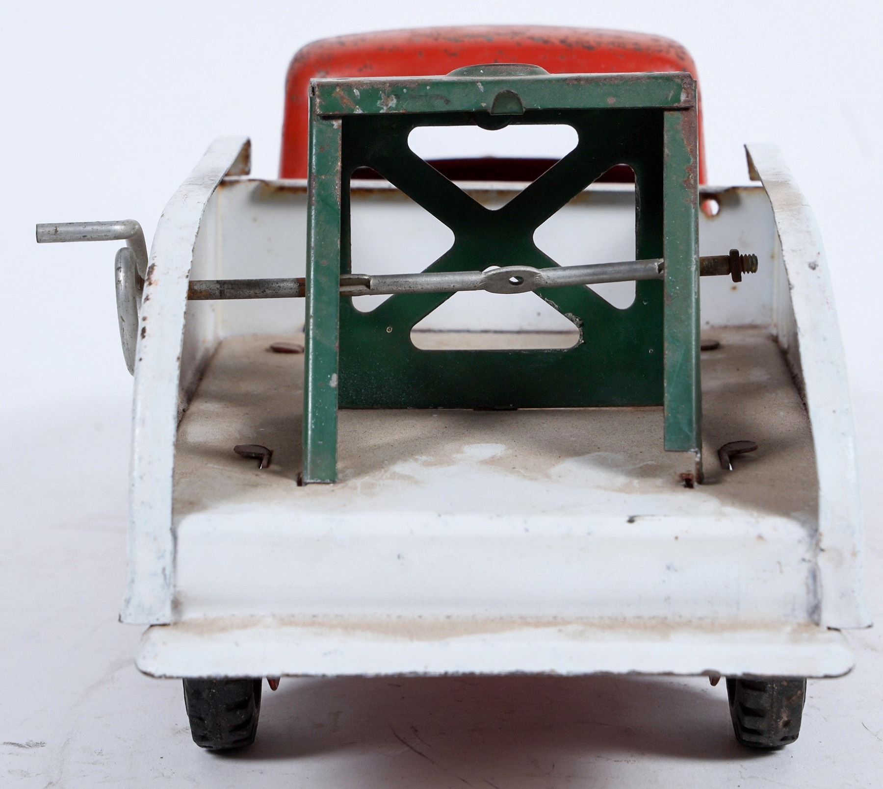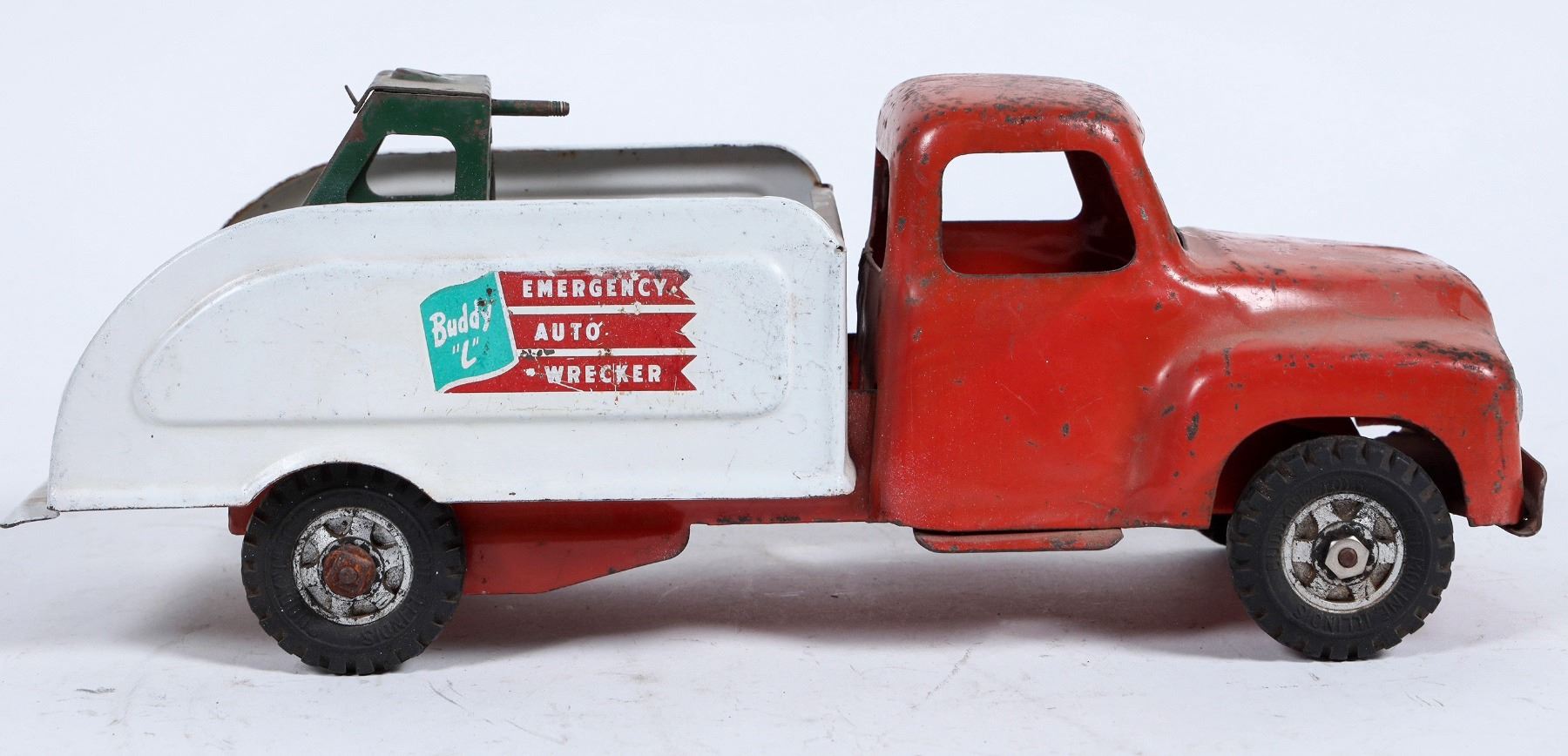 Buddy L Emergency Auto Wrecker truck, missing the elevated lift crank. Red truck, white bed, significant play. 16". Displays nicely. Buddy L toys are, of course, among the most highly collected in America.