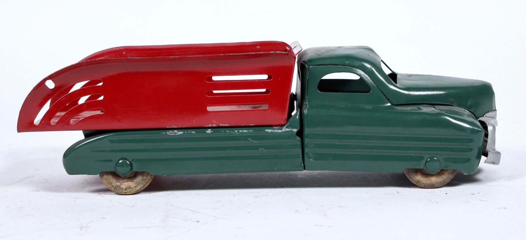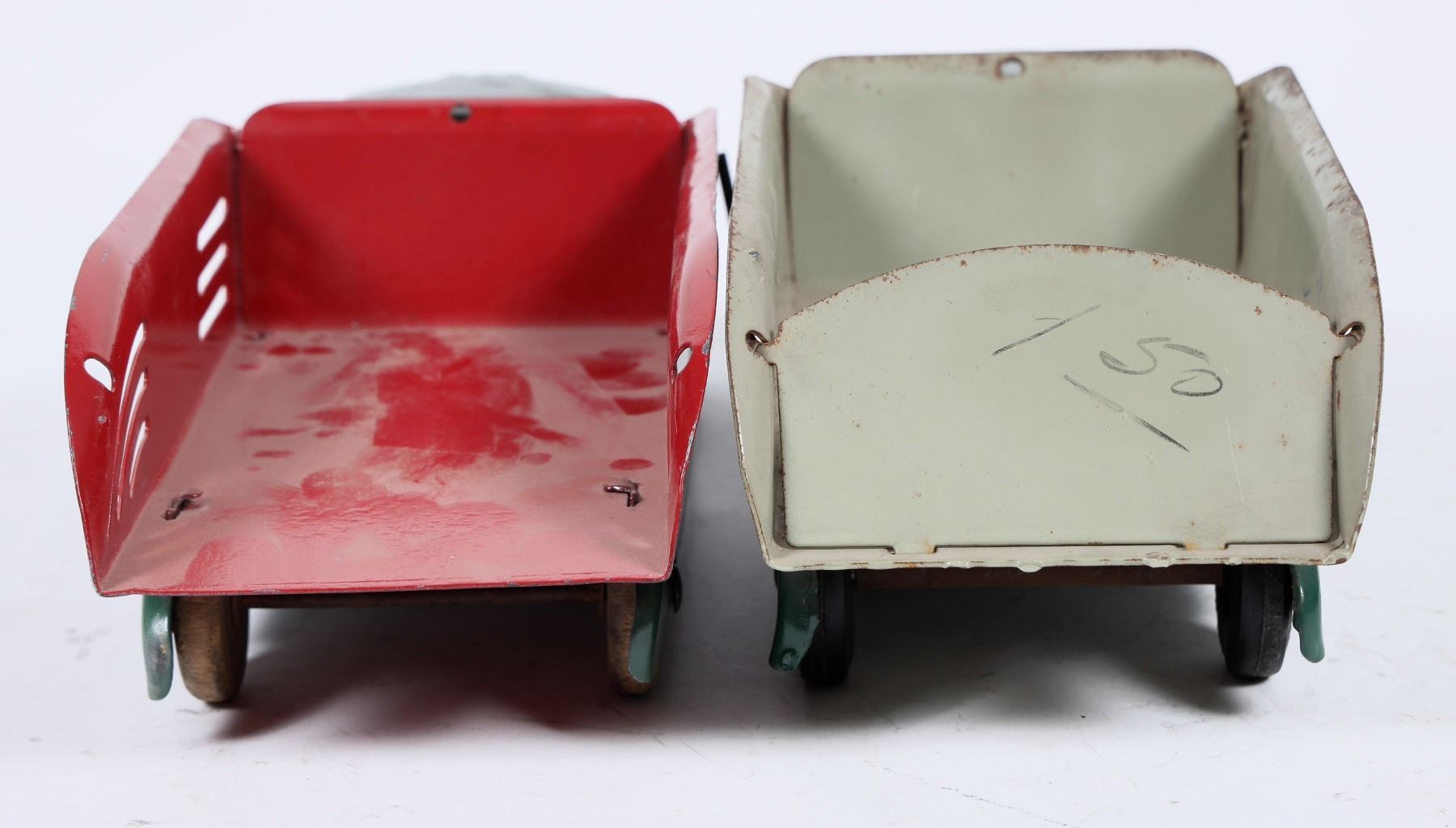 Buddy L Trucks in good condition. Truck A is missing the back plate and is not built to lift the rear with a dump lever. Truck A's wooden wheels spin freely though they have seen some mileage and wear. The rusted axles remain straight. The car is green with a red truck bed.