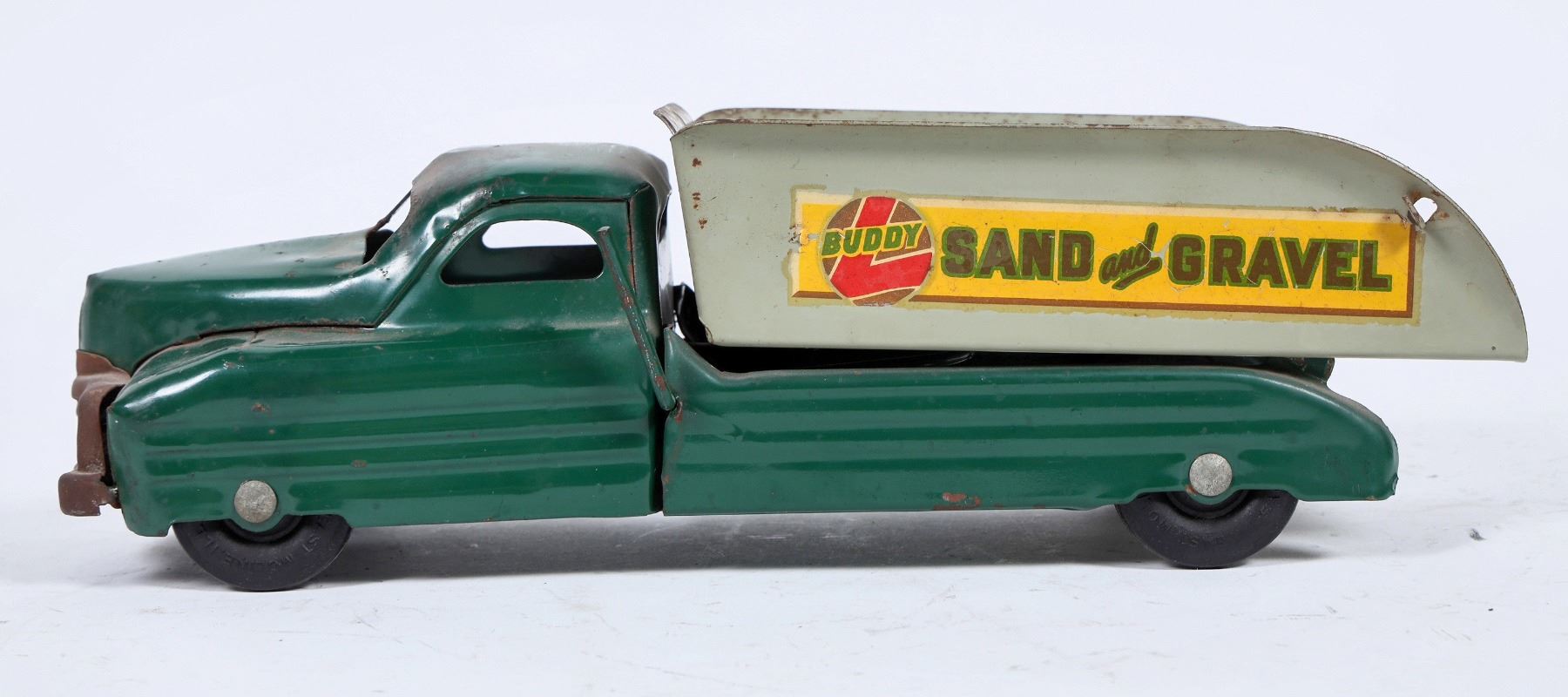 Truck B, the green/tan "Sand and Gravel" truck is complete with a functioning dump lever and back plate . Truck B's wheels are made of black polymer and don't show significant wear, with "Buddy 'L' Toys / East Moline. Ill" in raised lettering. The back plate has "1.50" hand-written in marker.