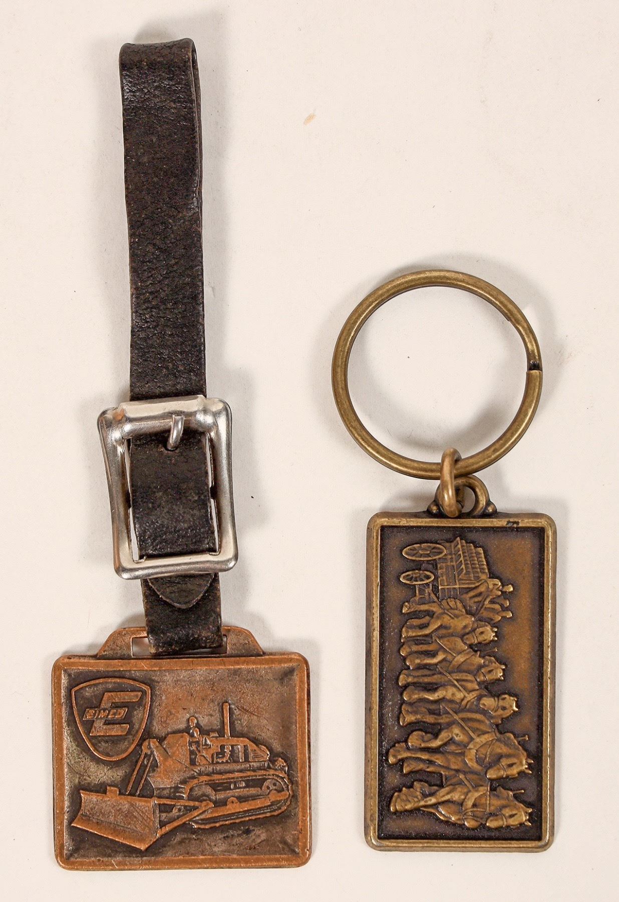 Brass key fobs. Budweiser with Clydesdales, Eimco with bulldozer.[