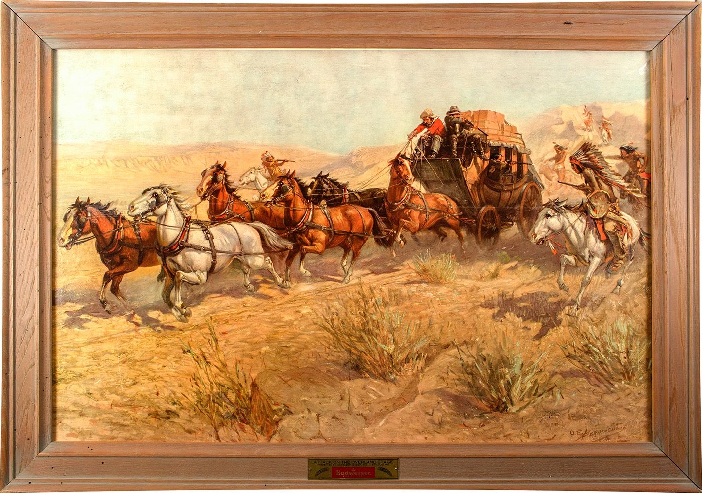 Print of Budweiser Stagecoach Advertising which was displayed at bars. Framed, 29" x 42.4". State: City: Date: ID# 49790