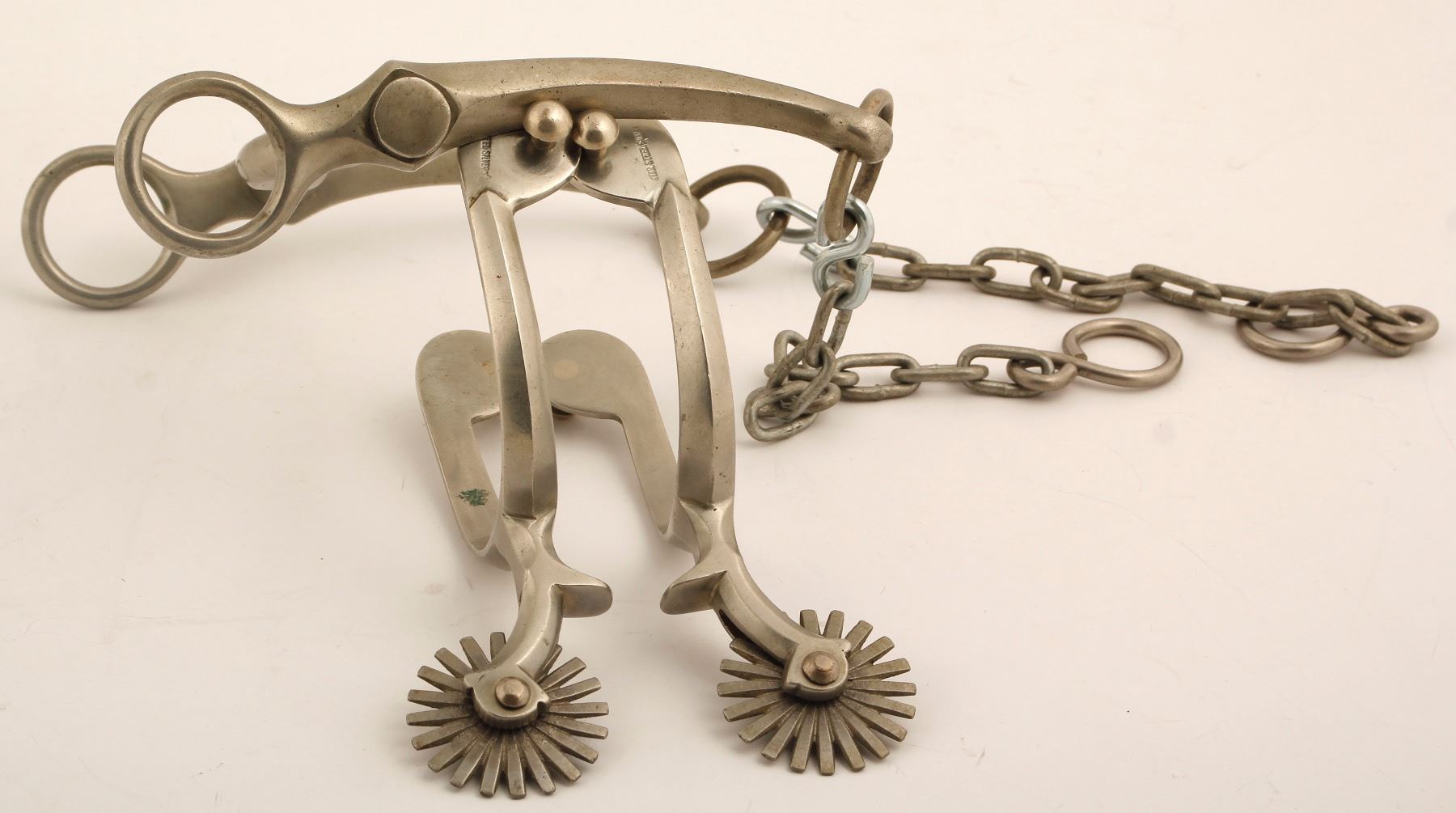 Buermann Star Steel silver marked bit & spur set.Listed in their #35 catalog as Panama Bit and Cowboy Spurs. Mouth is 5” wide & length of bit is 6 ½” from top of bridle rings to bottom of bit with a nice original set of rein chains attached. Spurs have 1 ½” 20 point rowells. This set is in near mint condition and well marked. Date: City: State: HWAC# 62021
