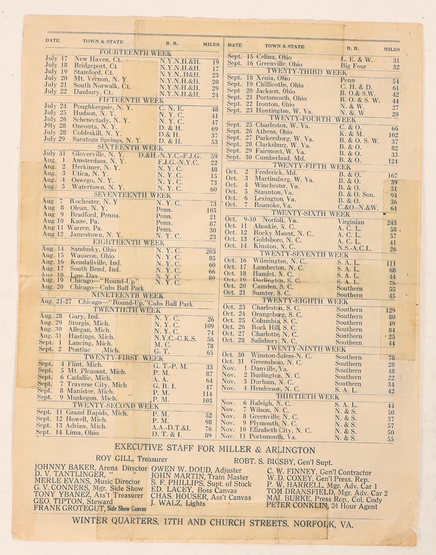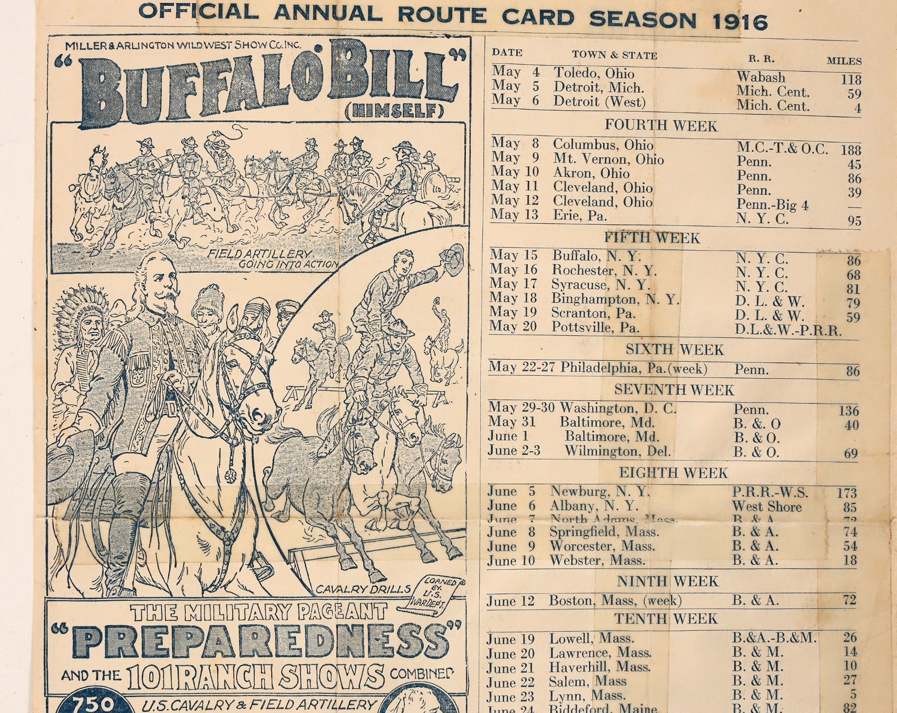 Official Annual Route Card with complete schedule dates for season 1916. Listed as Military Pageant "Preparedness." Reverse side indicates more schedules, along with winter quarters (Norfolk VA). First route sheet for 1916 season, which was Cody's last year in the arenas. Approx. 8.5 x 11, folds and tape repairs, overall good condition.