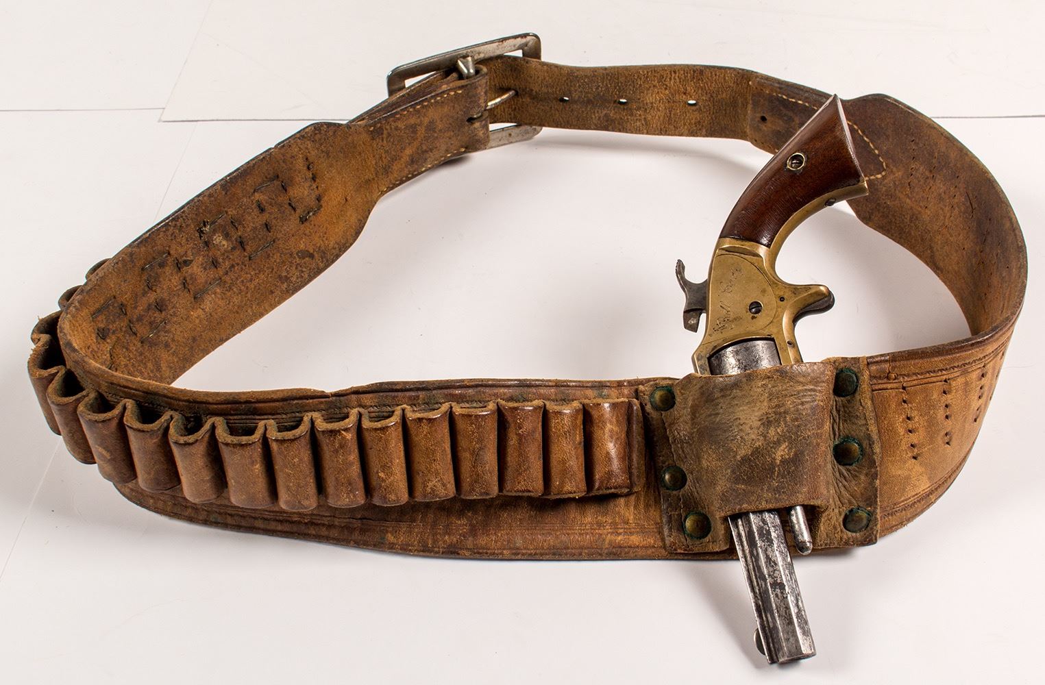 The belt was made by T. Flinn of Pueblo, Colorado who also supplied saddles for Buffalo Bill's Wild West Show before W. F. Cody was famous. This is an original 42 loop rifle cartridge belt of 45-70 cal.. Bill Cody had T. Flinn personally modify the belt whereas 20 belt loops have been removed for replacement for a single action .45 cal. Army holster and gun. Buffalo Bill also had a small holster riveted to this gun belt to hold his American Standard Tool Co. .22 at the small of his back. This indicates that Buffalo Bill had a primary gun plus the .22 American Standard pistol as back-up. All set for righted draw. State: City: Date: ID# 49646