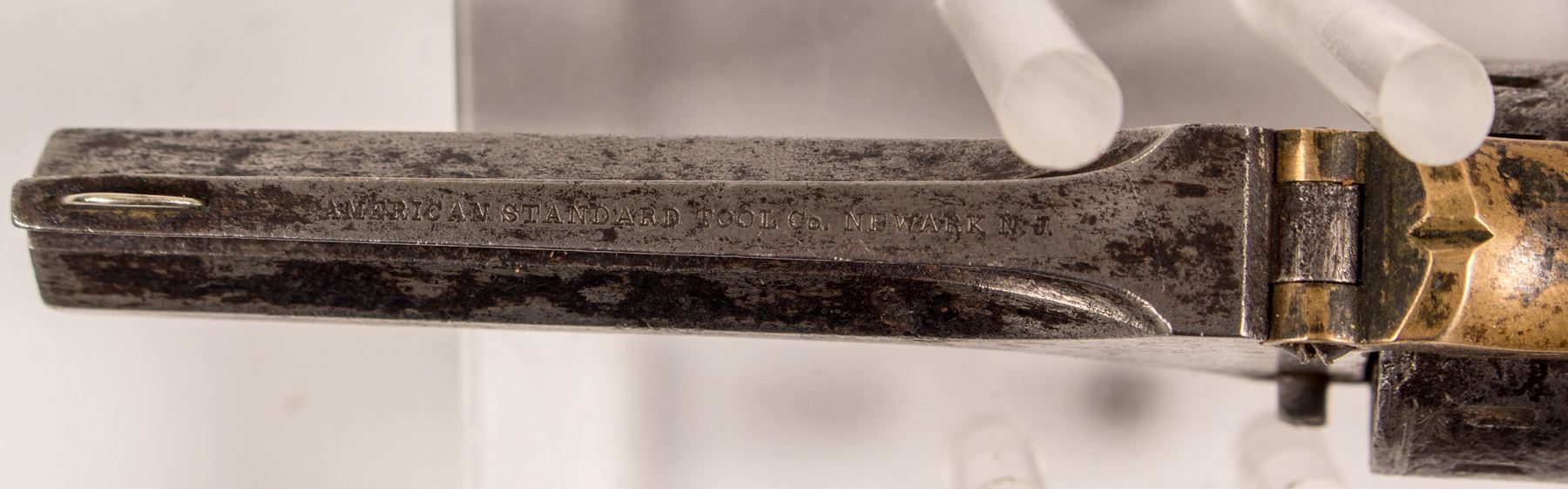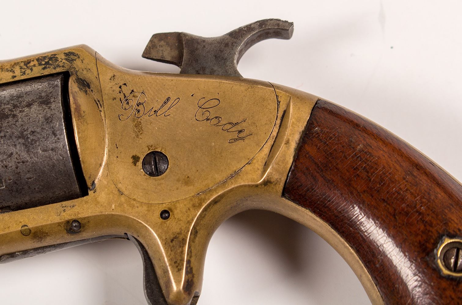 This is Buffalo Bill Cody's brass frame pistol made by the American Standard Tool Co. Newark, New Jersey and is inscribed as such. It is chambered in .22 cal. black powder, was factory engraved and owned by "Bill Cody"; engraved on the left side of the frame. It is a 7 shot pistol S/N 318XX . It has fourteen cylinder rests to park the hammer spur between loaded cylinders. The cylinder scene is light but visible and the pistol needs mechanical attention. American Standard Tool Co. closely copied early Smith and Wesson #1 pistols . This an excellent and rare variation of the S&W #1 pistol with celebrity status of being owned by young Buffalo Bill Cody. This is a rare opportunity to own a piece of Western Americana that was carried by an American Legend, the famous Buffalo Bill Cody.