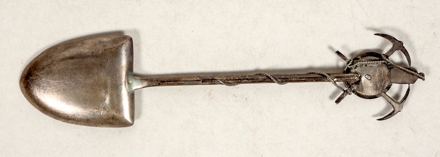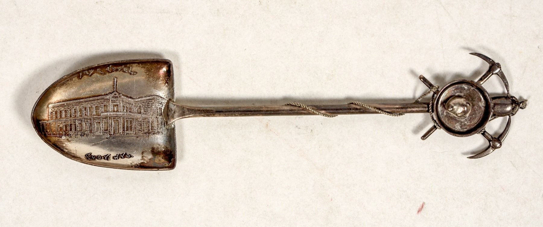 Buffalo Bill Hotel souvenir spoon Cody, Wyoming. Die cut ladle of hotel. End of handle shaped of pic axes and miners pan w/nugget inside pan and rope wrapping around the handle. .