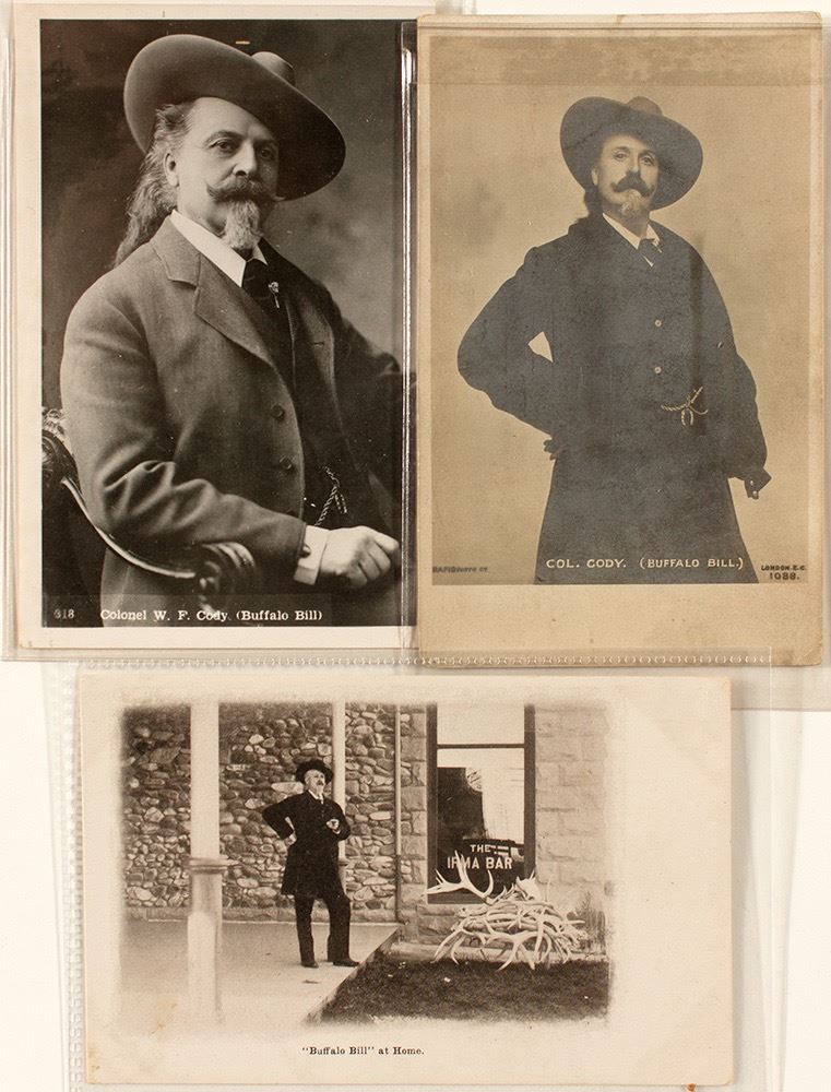 For many, the idea of the American west can be summed up in the image that was "Buffalo Bill." This lot has 3 postcards, including 1 real photo card. All 3 post cards are unmarked and show the famous western showman during different stages of his life. The wear on the postcards vary from little to some. City: State: United States Date: hwac# 238
