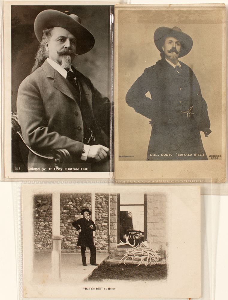 For many, the idea of the American west can be summed up in the image that was "Buffalo Bill." This lot has 3 post cards, including 1 real photo card. All 3 post cards are unmarked and show the famous western showman during different stages of his life. The wear on the post cards vary from little to some.