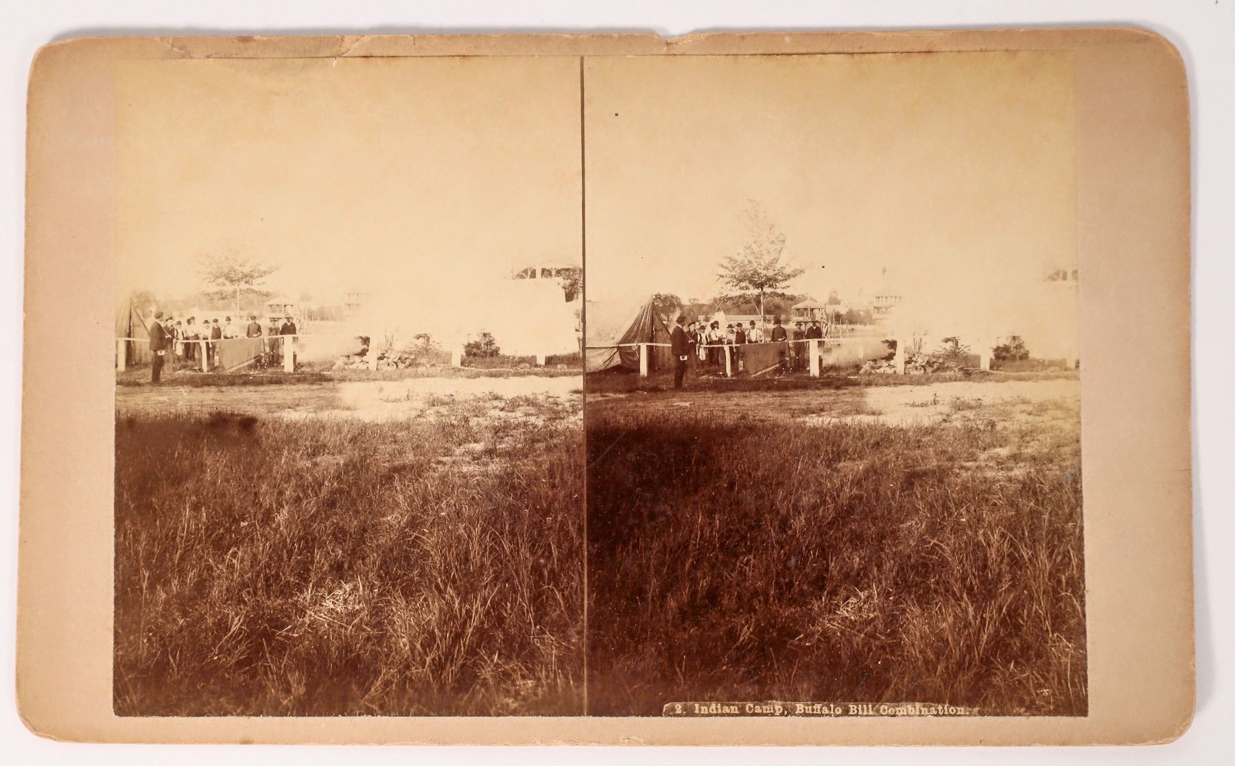 Stereoview marked Indian Camp, Buffalo Bill combination by unknown photographer. 4x5.75". c. 1895? Less contrast on left image.