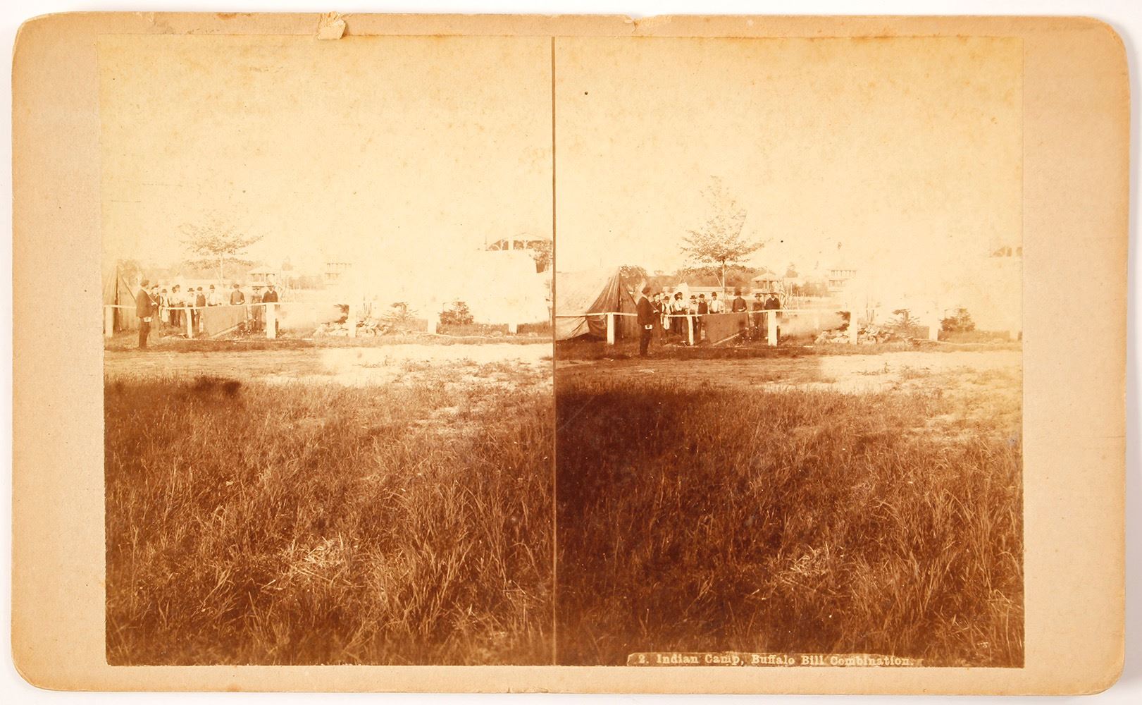 Buffalo Bill was perhaps the most famous Wild West performer. This view is labeled as "2. Indian camp. Buffalo Bill combination" and shows a group of men at a fence with a tent in the background. No photographer listed. Small crease on upper left, does not detract from view. HWAC# 53215 Date: Location:
