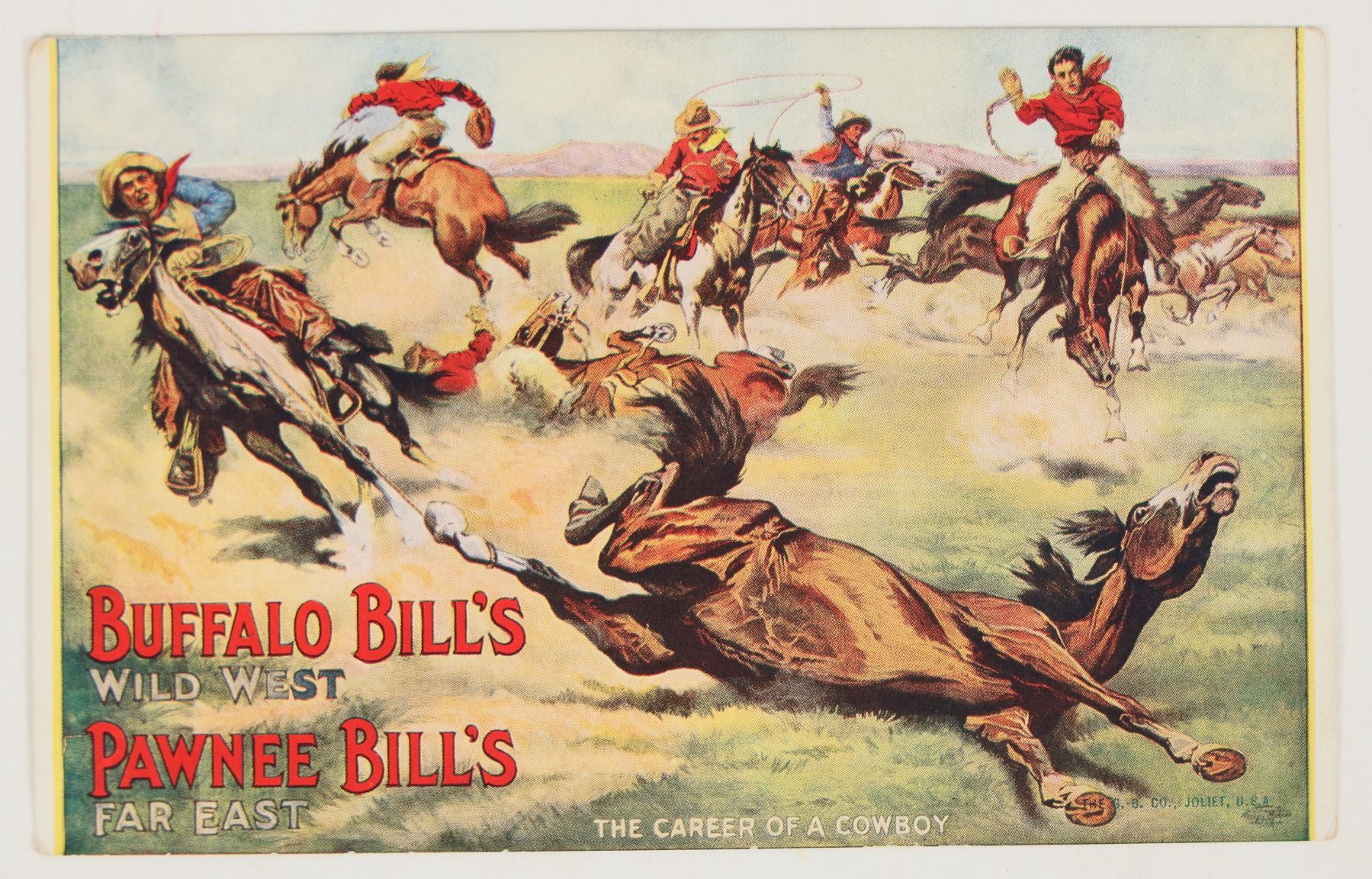 c1880, Buffalo Bill's Wild West /Pawnee Bill's Far East Show Post Card postcard. Titled The Career of a Cowboy"