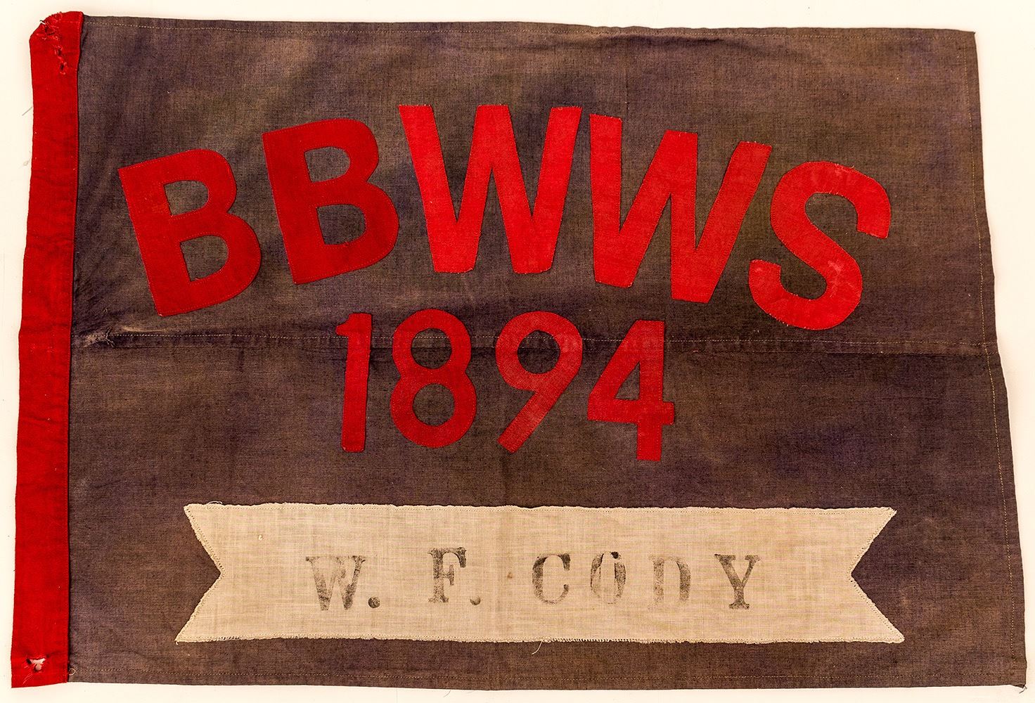 A splendid cloth duidon with gray background. BBWWS 1894 and the left side border are in red, W. F. Cody is on the bottom white fabric.There are 2 small tears on the left gray side, otherwise nice condition. 18.75" x 27.75". Consigned by The Cowboy Connection in Livingston, MT. State: City: Date: ID# 49054