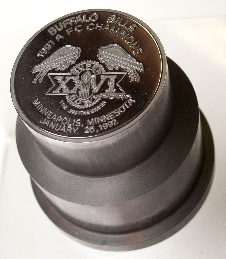 Official AFC "Buffalo" die side for the Super Bowl coin. The opposite side would be the Washington Redskins of the NFC, the eventual winner of this Super Bowl. The game was played in the Metrodome in Minneapolis. This particular game had such notable moments as Thurman Thomas, Buffalo`s star running back, missing the first 2 plays because he had misplaced his helmet. The process of "coining" is the stamping with the coin die, 1 of 2 dies required to stamp the inverse images to be struck on each different side of the coins. Made of hardened steel, it weighs 1.5 lbs. and dates to January 26, 1992. These are generally destroyed. A rare and unique find.