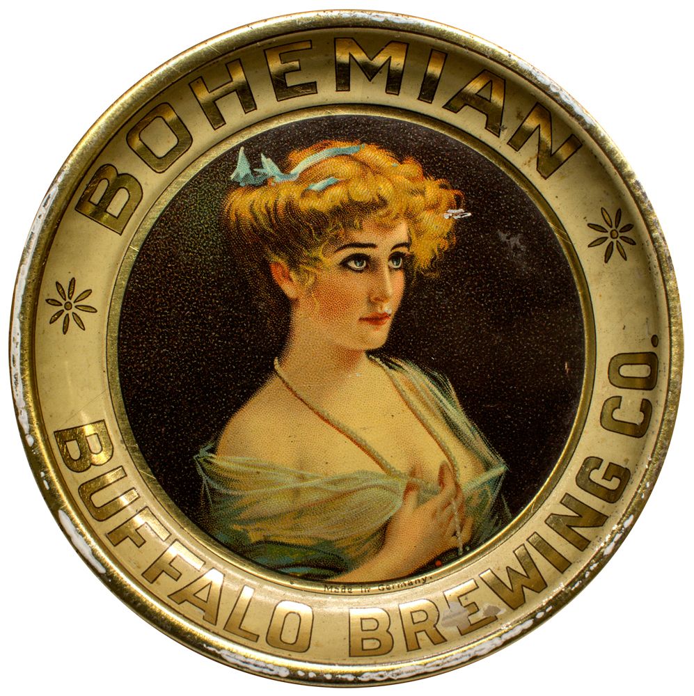 Hard to find in this condition! Gold lettering around white/yellow rim: "Bohemian. Buffalo Brewing Co." Vignette of lady with blue ribbon, pearl necklace, and shear dress. Made in Germany. Small nicks to vignette. Chips around rim. Measures 4 1/4" in diameter. Burt Collection