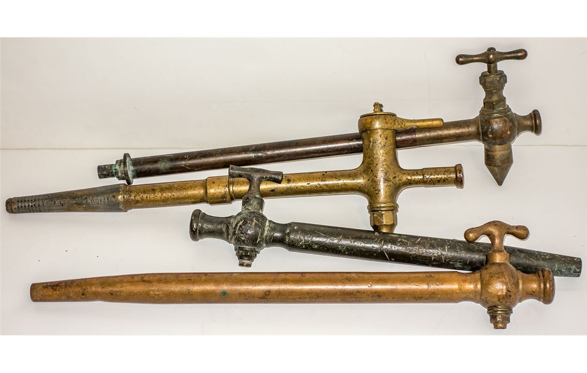 Four barrel Bung taps. Two are marked "BB" for Buffalo Brewing Co. and one is marked from their predecessor Sacramento Brewing Co. The fourth is unmarked. Each is about 2 to 2.5' long. Brass with spigots.