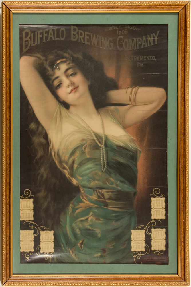 "Greetings 1909" from the Buffalo Brewing Co. This 16" x 25" broadside features a woman in a very seductive pose: her arms are up behind her head, her eyes look hopeful, her cheeks are flushed. Her long brown hair drops down behind a gold and green dress. She wears gold bracelets and a pearl necklace. The calendar months are printed below her. The artist is B(ernard) Zickendraht, a German painter who lived 1854-1937. In a damaged 20" x 30" frame. Burt Collection